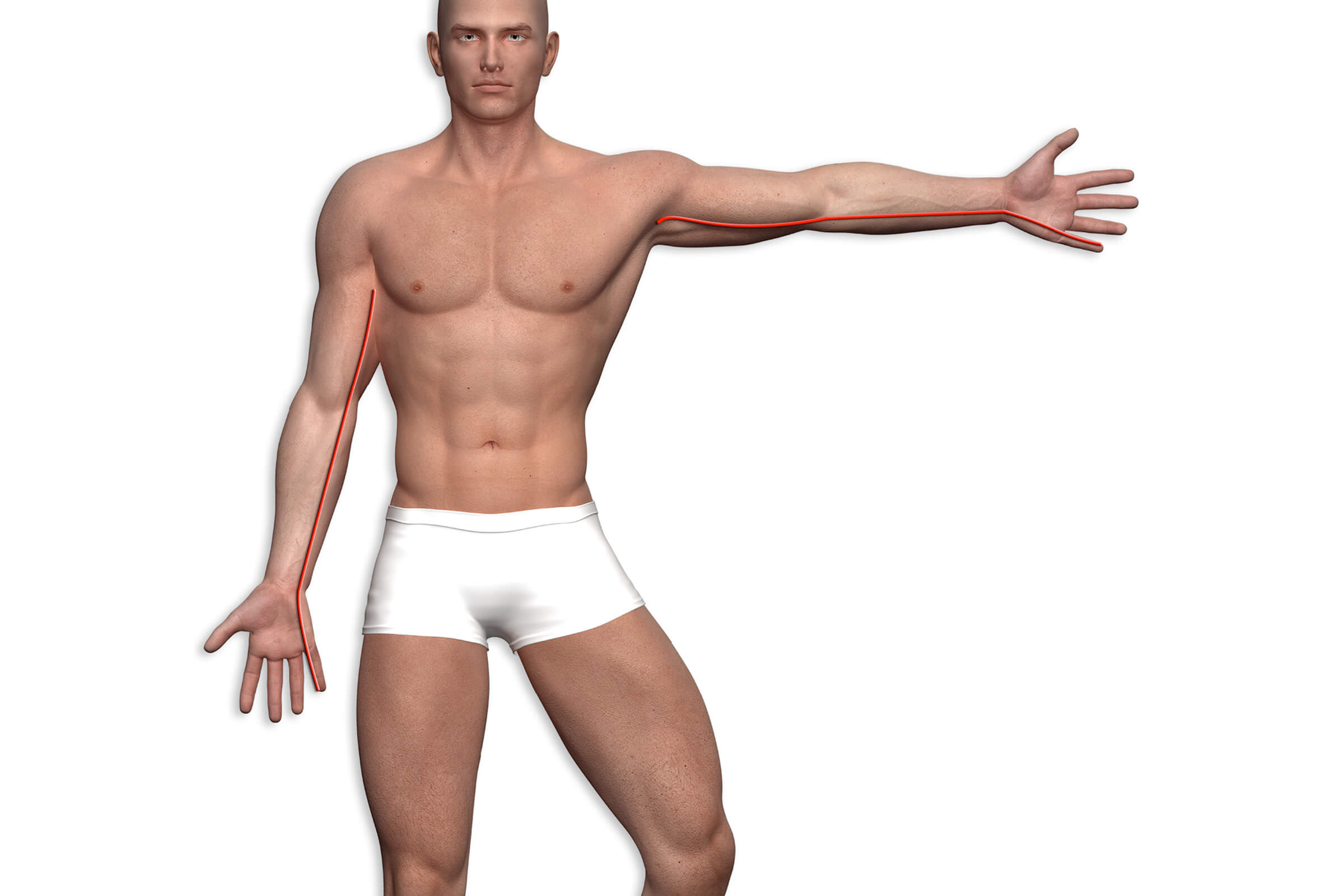 At the medial end of the elbow crease, above the medial (inner) epicondyle when the elbow is flexed.