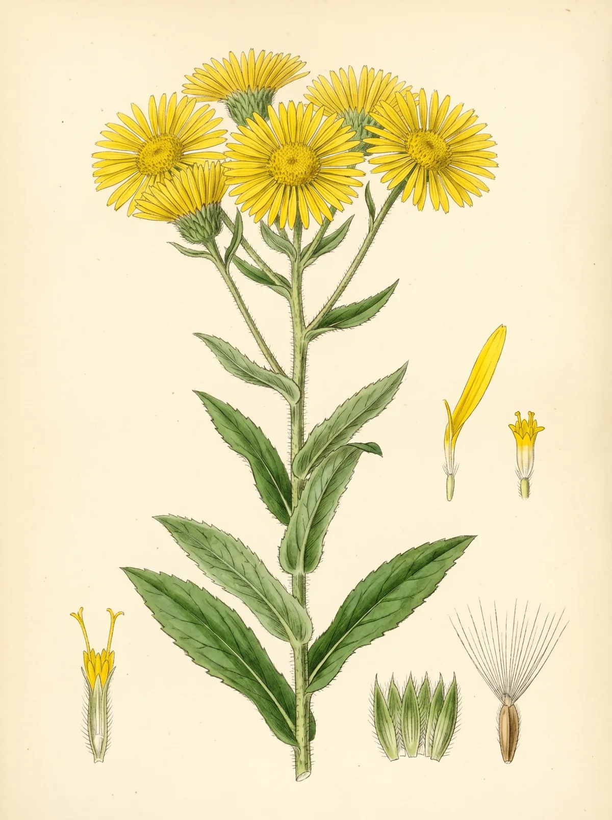 Die Blüten enthalten Sesquiterpenlactone (Britanin, Inuchinenolid), Flavonoide und ätherische Öle. Die Forschung stützt sich überwiegend auf In–vitro– und Tiermodellstudien — klinische Humanstudien sind bislang rar.- Prokinetisch: fördert die Magen–Darm–Motilität und lindert Dyspepsie (Tiermodelle)