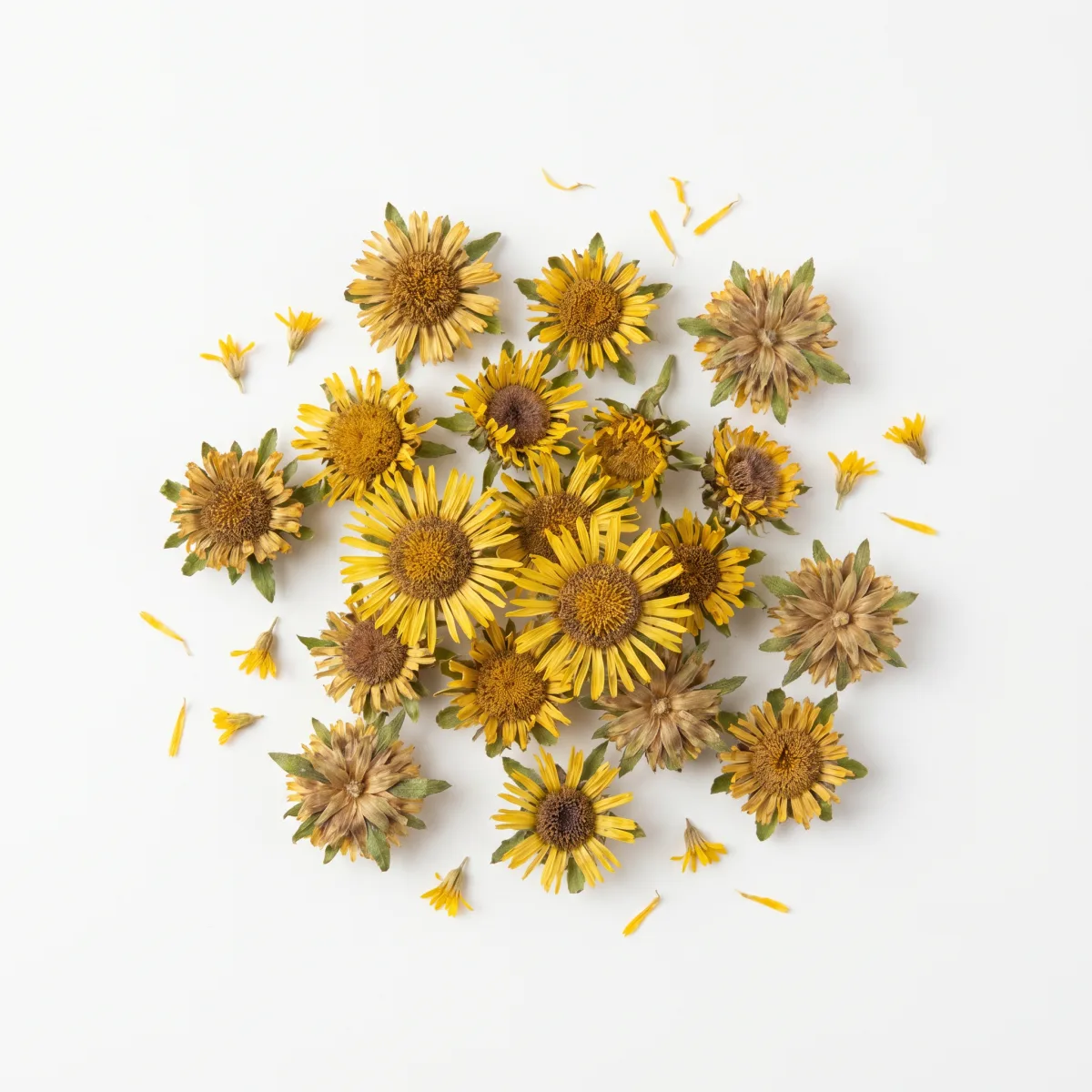 Die Nacherntebehandlung von Xuan Fu Hua ist anspruchsvoll, da die zarten Blütenköpfe empfindlich auf Wärme und mechanische Belastung reagieren. Die feinen Trichome des Pappus erfordern beim Umgang besondere Sorgfalt — bei Großmengen sind Mundschutz und Handschuhe empfehlenswert. Die Chinesische Pharmakopöe schreibt eine Restfeuchte von maximal 13 % vor.