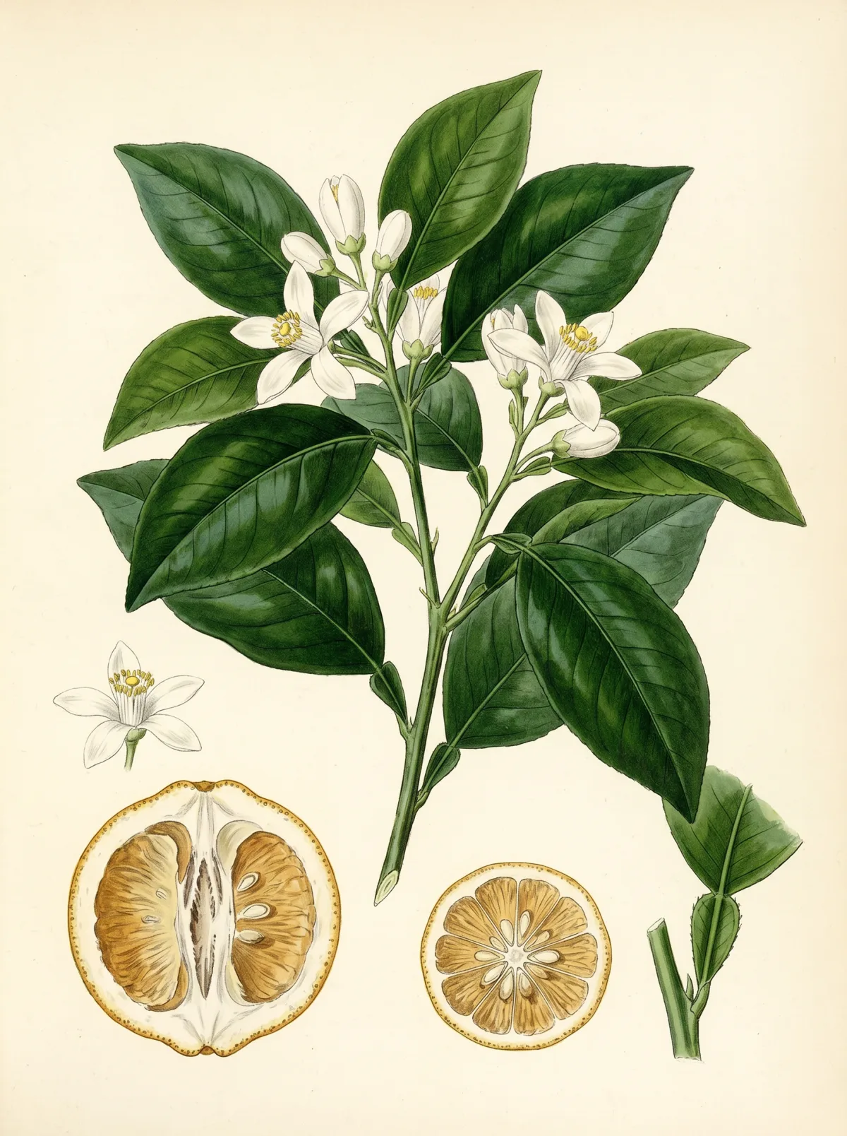 Citrus aurantium L. — die Bitterorange oder Pomeranze — gehört zur Familie der Rutaceae (Rautengewächse). Der immergrüne, bis zu 10 m hohe Baum trägt elliptische, glänzend dunkelgrüne Blätter mit charakteristisch geflügeltem Blattstiel. Die Blüten sind weiß, stark duftend (Neroli–Öl). Die Frucht ist rund bis leicht birnenförmig, im unreifen Zustand dunkelgrün und fest, im reifen Zustand orange mit grob–körniger, öldrüsenreicher Schale.