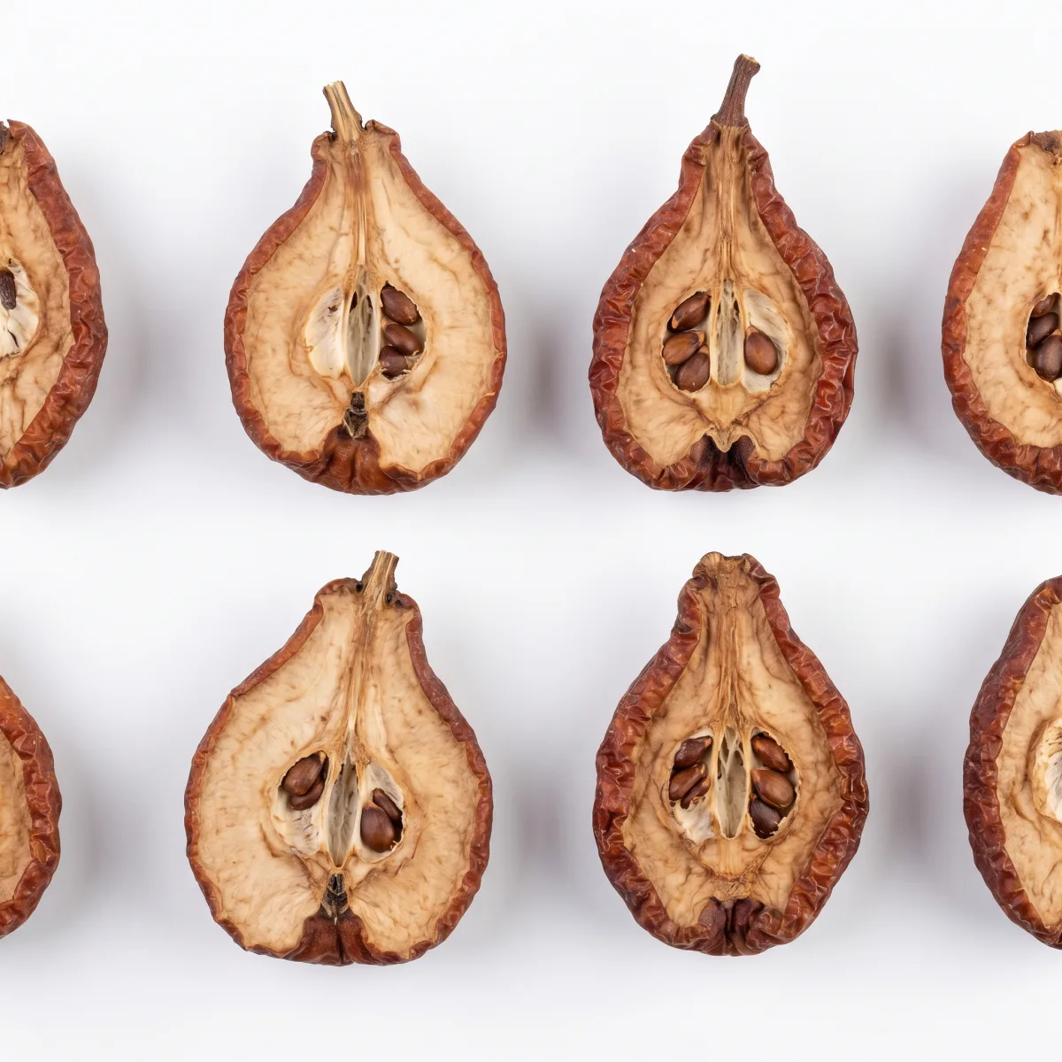 - Gedämpft und getrocknet — Chao Mu Gua (Standardverfahren der Pharmakopöe):