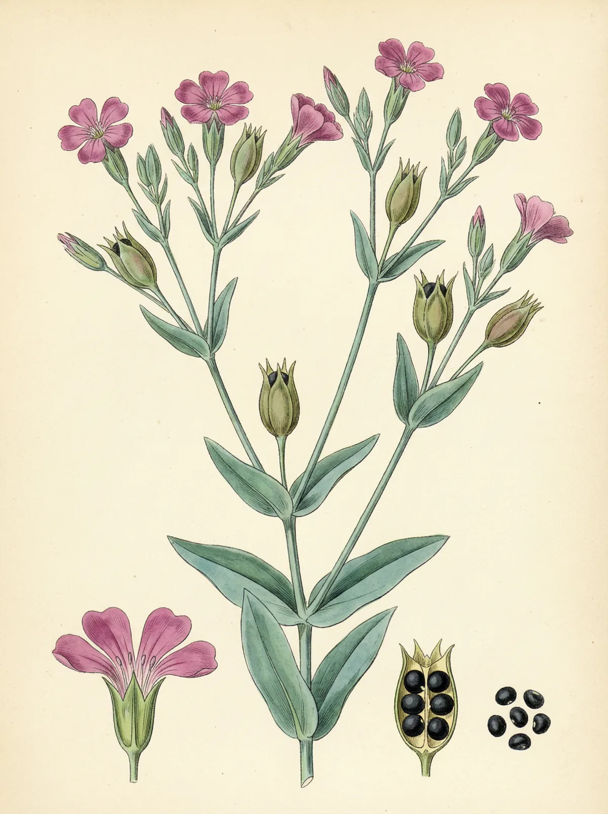 Vaccaria hispanica (syn. Vaccaria segetalis, Saponaria vaccaria) gehört zur Familie der Caryophyllaceae (Nelkengewächse) und ist eine einjährige, aufrechte Pflanze, die 30–80 cm Wuchshöhe erreicht. Der Stängel ist kahl, blaugrün bereift und gabelig verzweigt. Die gegenständigen Blätter sind lanzettlich bis eiförmig-lanzettlich, sitzend, am Grund verwachsen und ebenfalls blaugrün bereift — ein typisches Merkmal der Gattung. Die Blüten erscheinen in trugdoldigen Rispen und leuchten in einem charakteristischen Rosa-Rot; die fünf Kronblätter sind schwach gekerbt und sitzen in einem aufgeblasenen, rippigen Kelch.