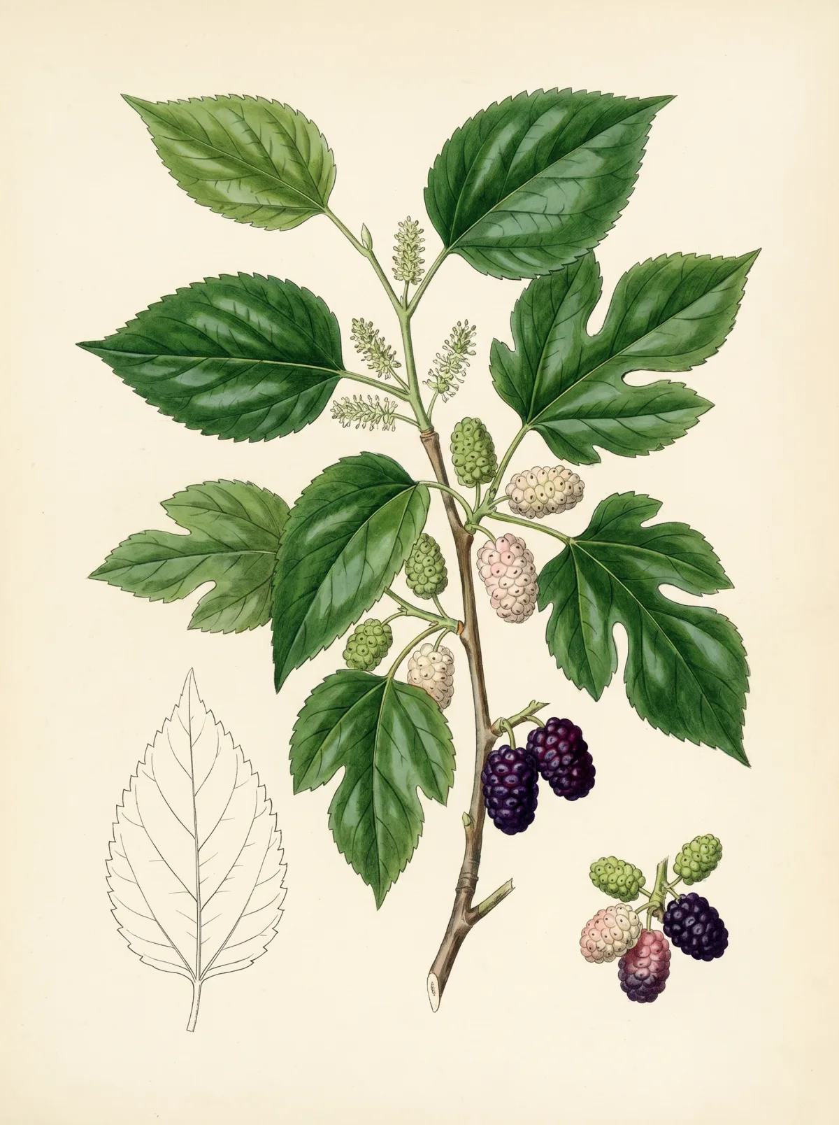 Die enge Verwandtschaft mit Sang Bai Pi (Wurzelrinde), Sang Zhi (Zweige) und Sang Shen (Früchte) macht den Maulbeerbaum zum vielseitigsten Arzneilieferanten der TCM — jeder Pflanzenteil hat seine eigene therapeutische Nische.