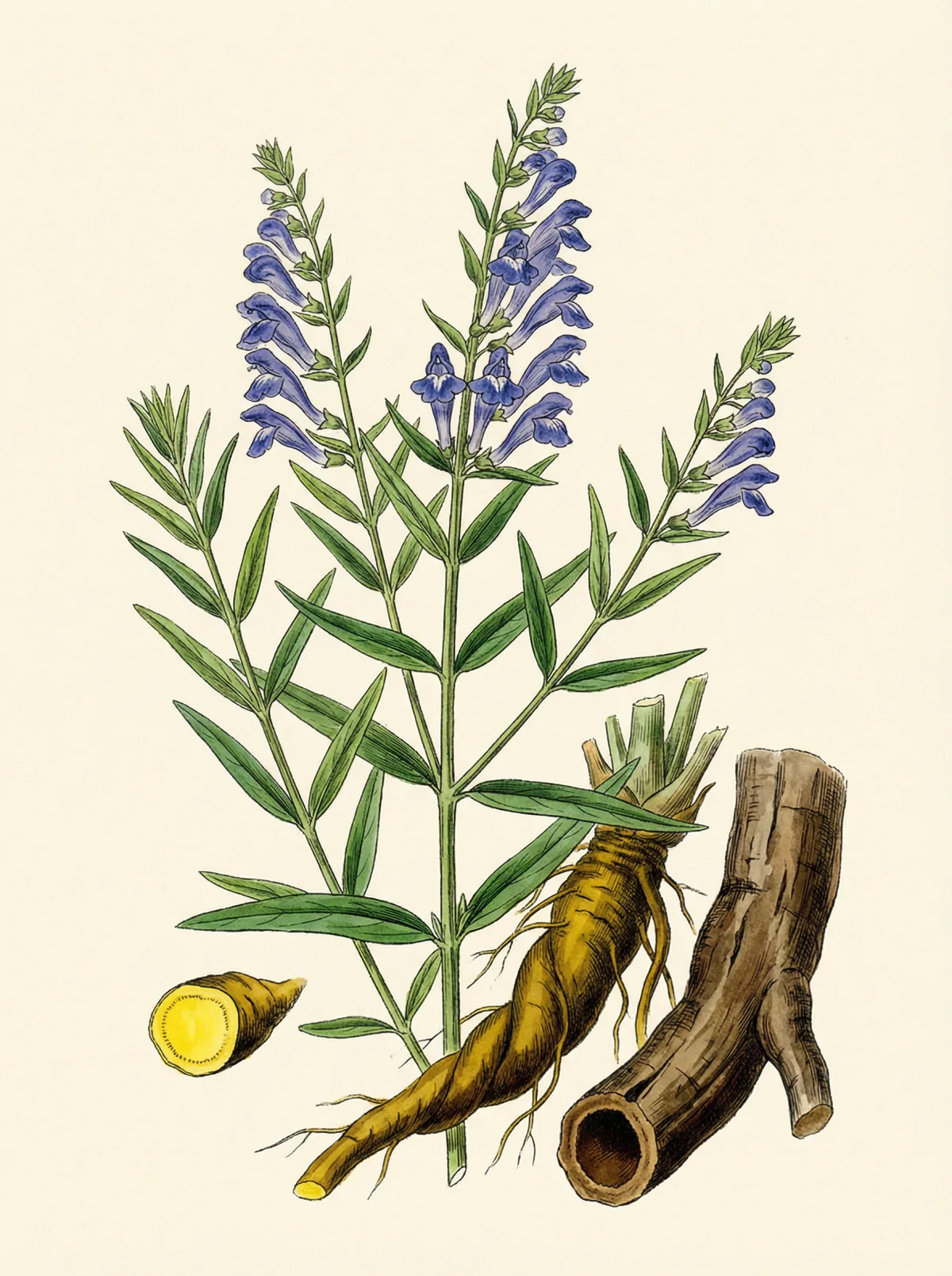 Das Baikal–Helmkraut wächst in den kargen Steppen Sibiriens und der Mongolei — seine Wurzel enthält Baicalin, einen Flavonoid–Stoff, der in über 2000 Studien auf seine entzündungshemmende und antivirale Wirkung untersucht wurde.
