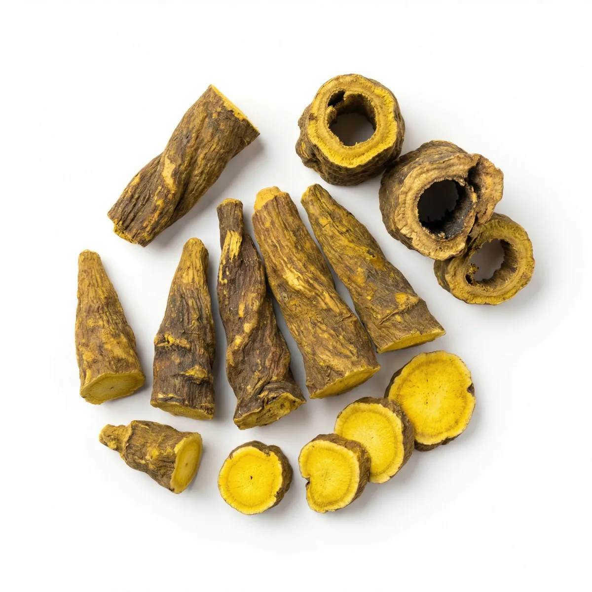 Huang Qin — die Wurzel des Baikal–Helmkrauts — ist eines der wichtigsten Hitze–klärenden Kräuter der TCM. Seit über 2.000 Jahren wird es gegen Fieber, Entzündungen und feuchte Hitze eingesetzt.
