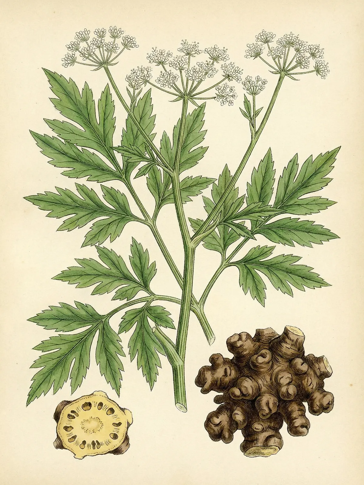 Chuan Xiong ist das wichtigste Kraut zur Bewegung des Blutes in der TCM. Sein aromatisches Rhizom durchbricht Blut–Stase, lindert Schmerzen und vertreibt Wind. Es wird als „Qi–Kraut im Blut" bezeichnet, weil es das Qi bewegt, um das Blut zu aktivieren.