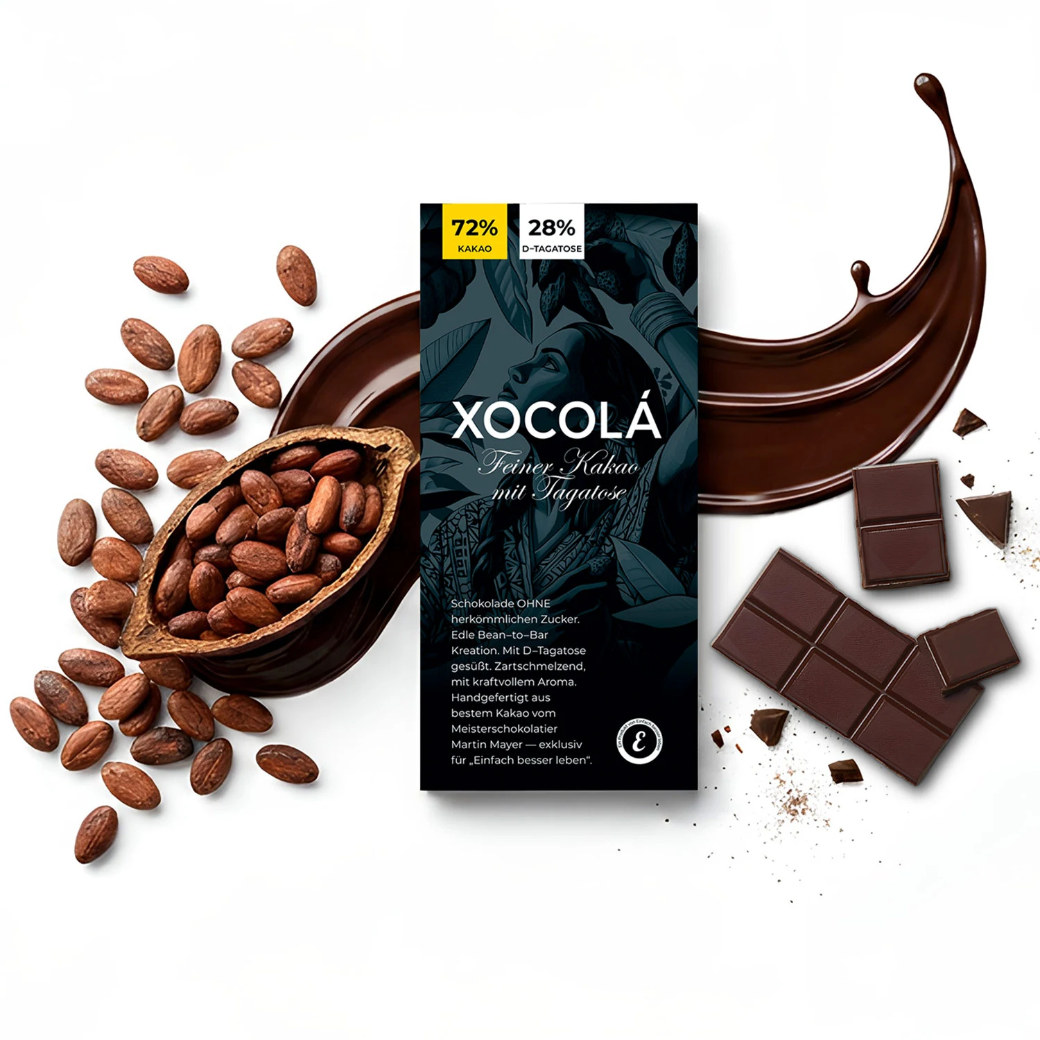 Una golosina de alta calidad para todos los que viven conscientemente - con un efecto bajo en azúcar, mucho cacao y la conciencia tranquila.