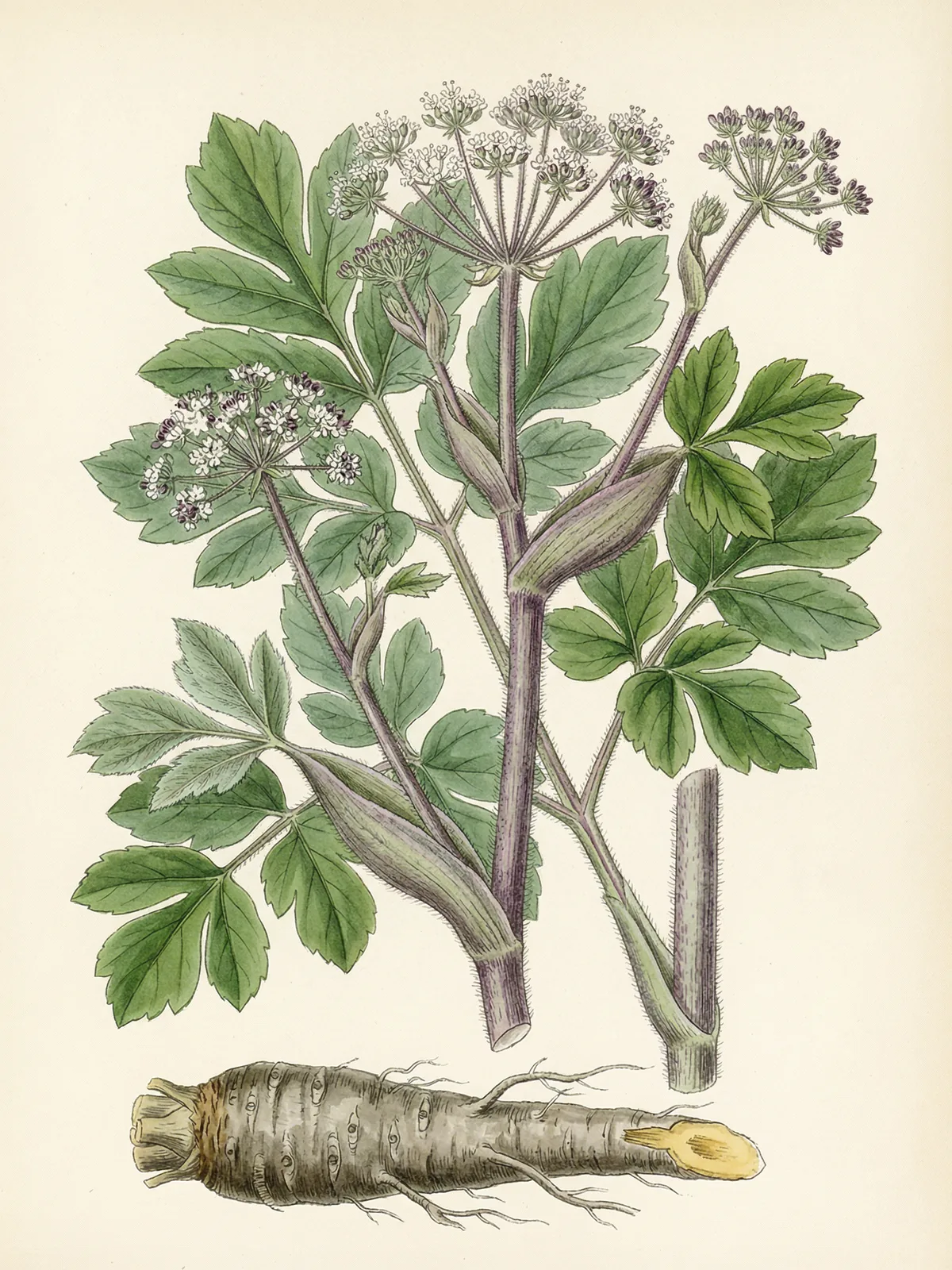 Die Blüten erscheinen in großen, zusammengesetzten Dolden und sind weiß bis gelblich–weiß. Die medizinisch genutzte Wurzel ist dick, fleischig und verzweigt, mit einer gelblich–braunen Außenseite und einem stark aromatischen, leicht beißenden Geruch. Beim Kauen entsteht ein prickelndes Gefühl auf der Zunge — ein Qualitätsmerkmal für die Arzneidroge.