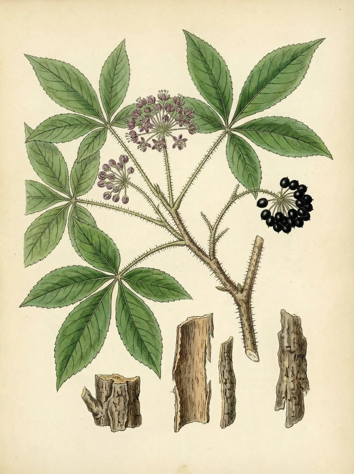 Botanisch bedeutsam ist die Abgrenzung zu verwandten Arten: Acanthopanax senticosus (sibirischer Ginseng, Eleutherococcus senticosus) liefert die Wurzel als adaptogenes Tonikum, während Periploca sepium — ebenfalls als „Wu Jia Pi“ im Handel — eine völlig andere Pflanzenfamilie (Hundsgiftgewächse, Apocynaceae) darstellt und kardiotoxische Cardenolide enthält. Eine eindeutige botanische Identifizierung ist daher für sichere Anwendung unerlässlich.