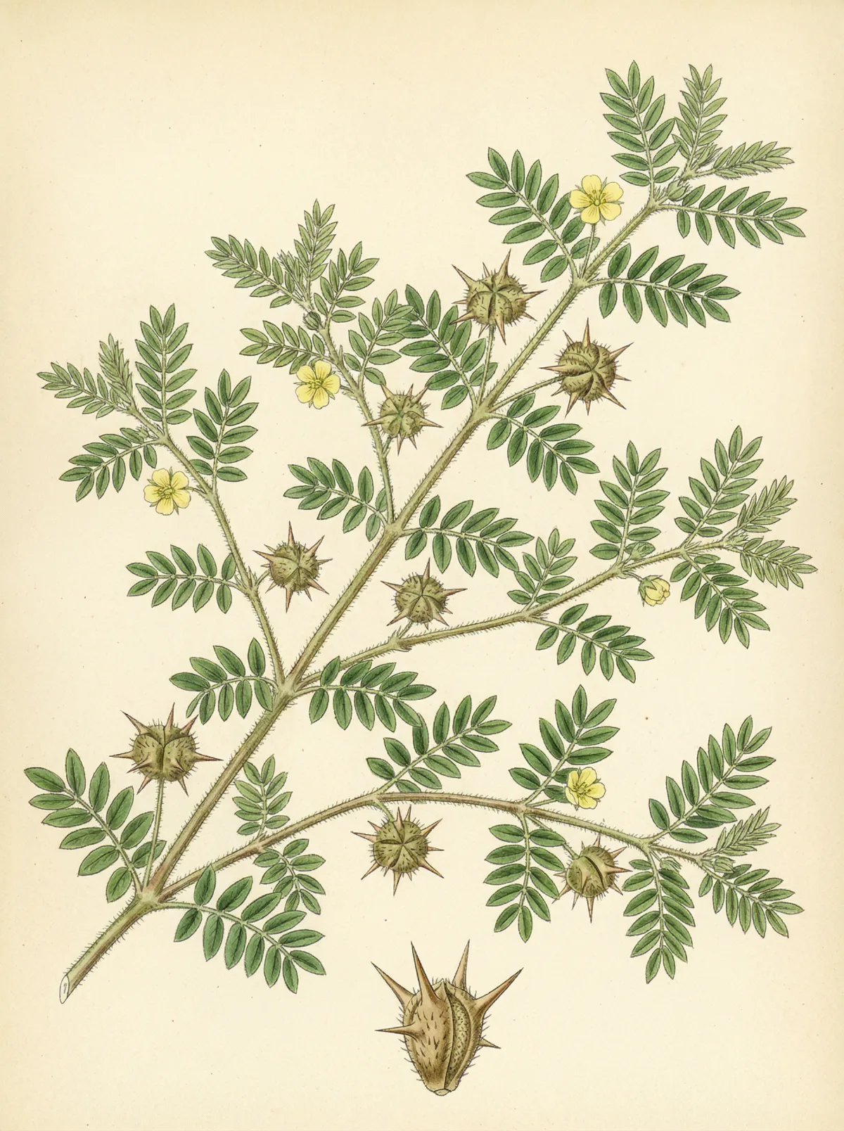 Die Frucht — der medizinisch verwendete Pflanzenteil — ist eine hartschalige Spaltfrucht, die in fünf stachelige Teilfrüchte zerfällt. Jede Teilfrucht trägt zwei kräftige Dornen, die auch durch Schuhsohlen stechen können. Getrocknete Früchte sind grünlich–braun und haben einen Durchmesser von etwa 1 cm.