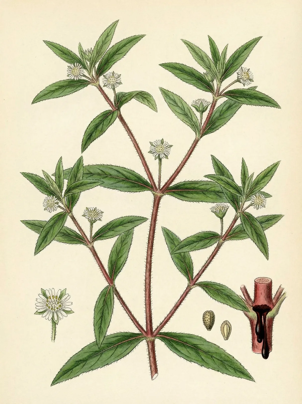 Die auffälligste Eigenschaft der Pflanze ist der schwarze Saft, der beim Zerreiben des Stängels oder der Blätter austritt — eine Reaktion der enthaltenen Polyphenole mit Sauerstoff. Eclipta prostrata ist bemerkenswert anpassungsfähig und wächst auf nahezu jedem feuchten Boden. Sie ist eine der wenigen TCM–Pflanzen, die weltweit als Wildpflanze vorkommen.