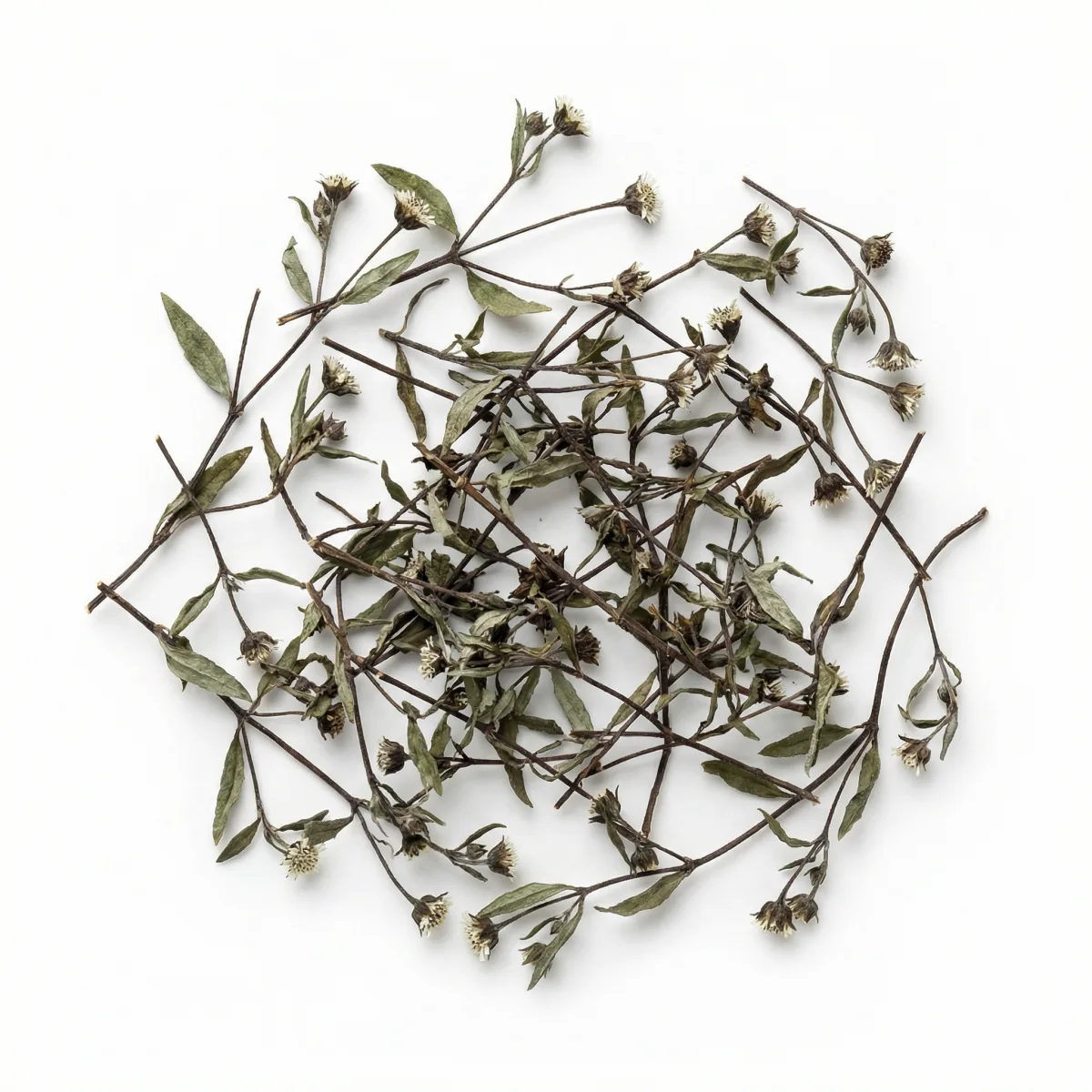 Han Lian Cao wird als ganzes Kraut verarbeitet — die schwarze Färbung des Saftes ist ein Qualitätsmerkmal: