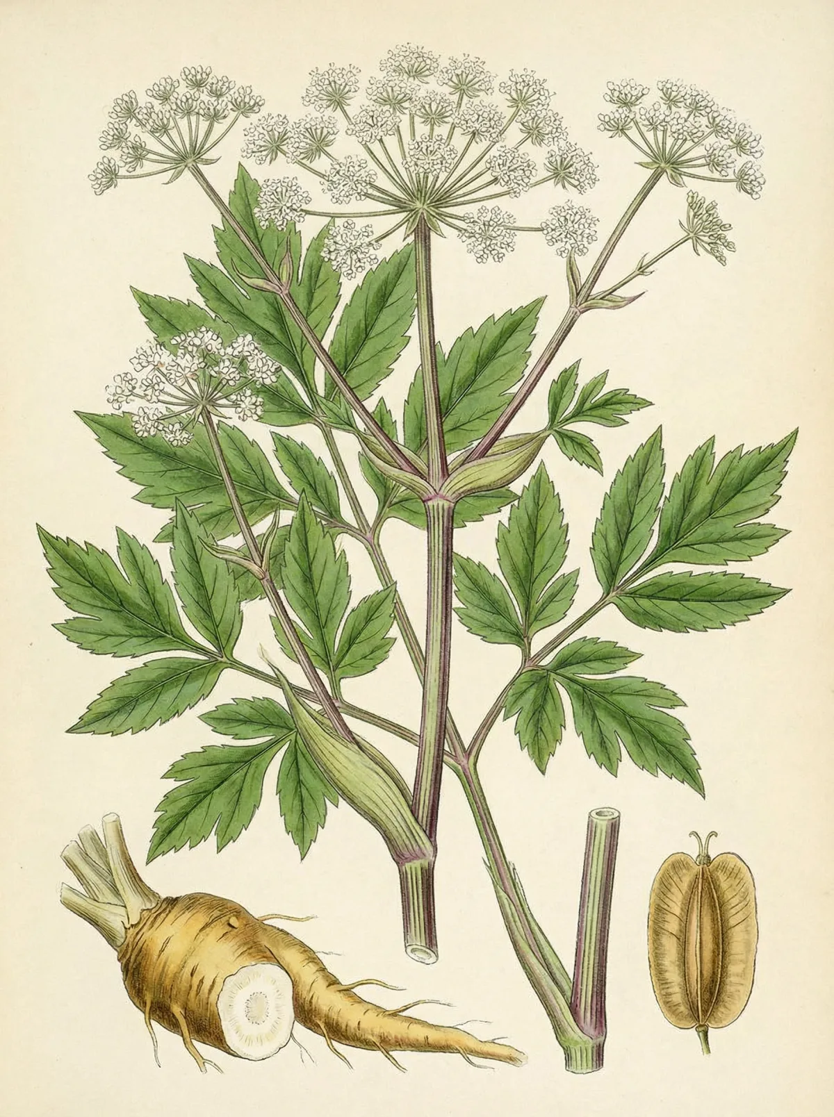 Die medizinisch verwendete Wurzel ist kegelförmig, 15–30 cm lang und hat einen stark aromatischen Geruch. Die Rinde ist hellbraun, das Innere weiß und mehlig. Beim Anschnitt tritt ein gelblicher Milchsaft aus, der die typischen Furocumarine enthält.