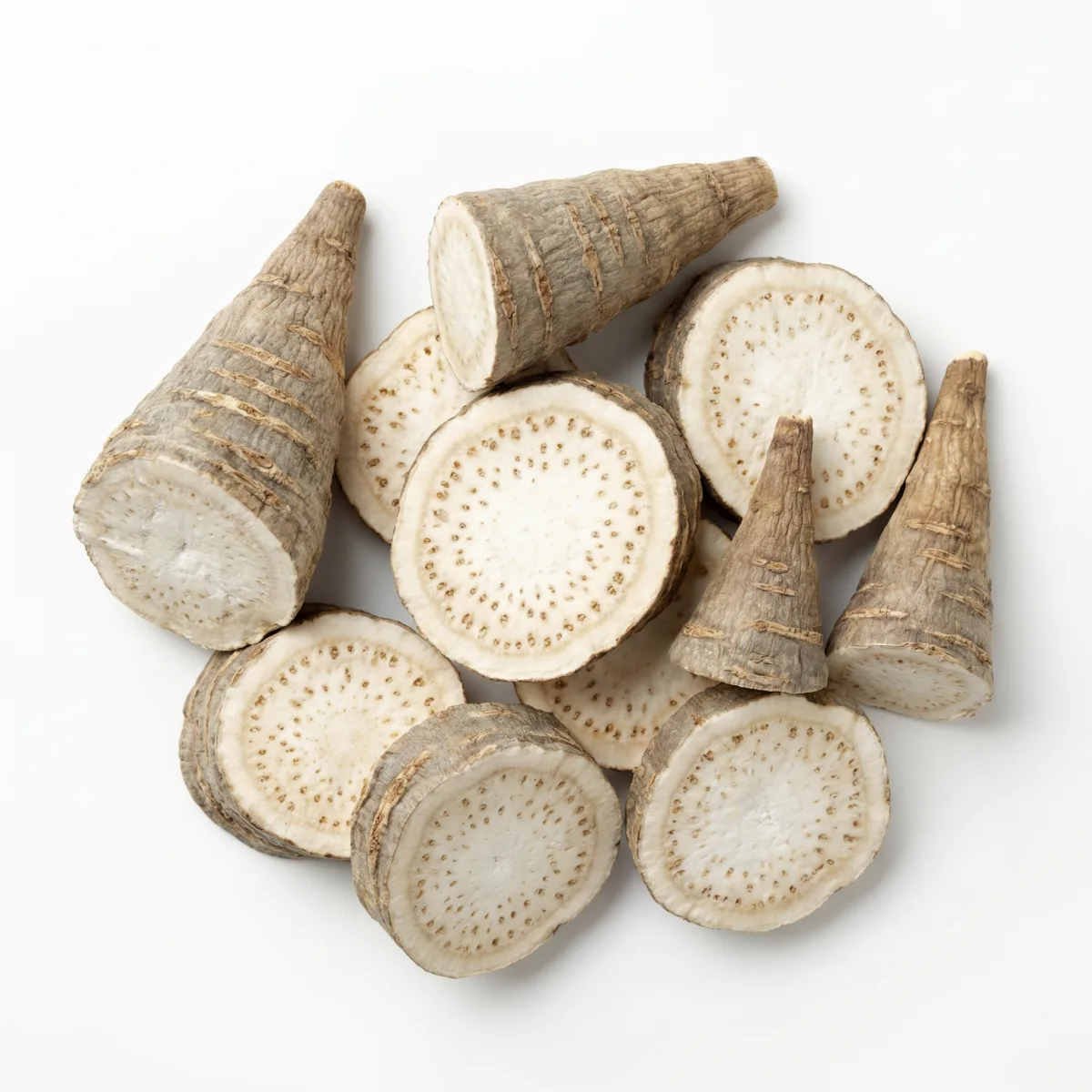 - Röstverarbeitung (Chǎo Bái Zhǐ) — leichtes Rösten in der trockenen Pfanne reduziert die trocknende Wirkung und mildert die Schärfe