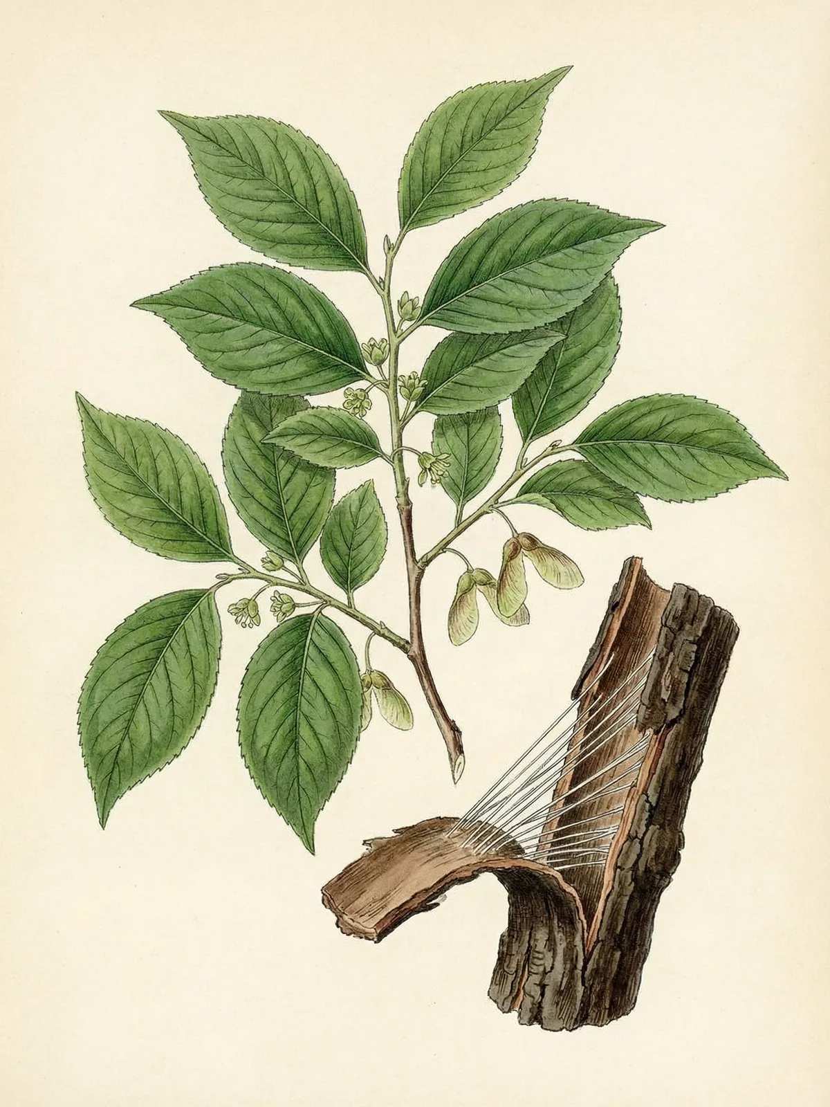 Eucommia ulmoides Oliv. ist ein laubabwerfender Baum aus der monotypischen Familie Eucommiaceae, der Wuchshöhen von 10–20 m erreicht. Die Blätter sind elliptisch, gesägt und erinnern entfernt an Ulmenlaub — daher der Artname ulmoides. Die Pflanze ist zweihäusig; männliche Bäume bilden Kätzchen, weibliche geflügelte Nussfrüchte.