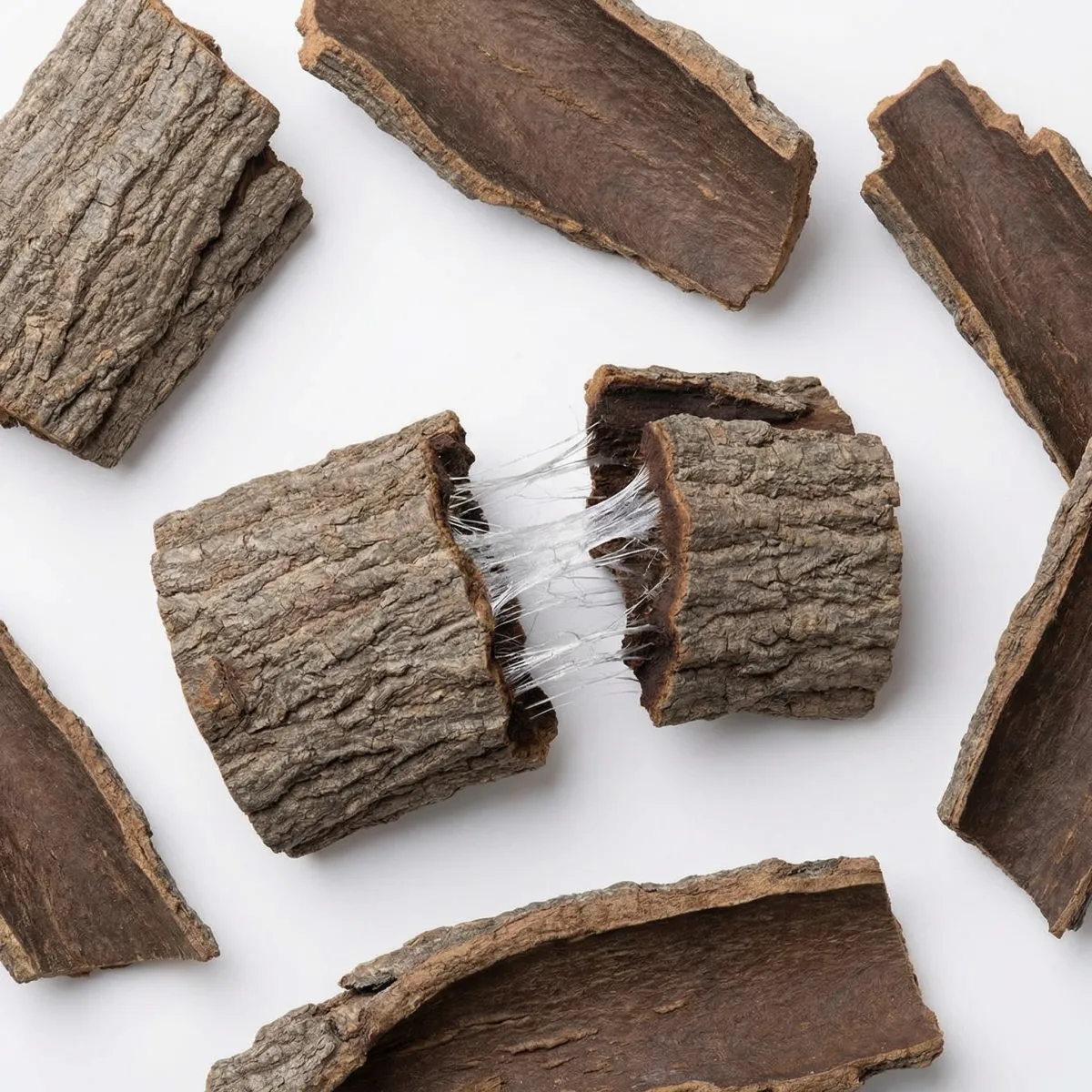 Beim Brechen der Rinde zeigen sich charakteristische silbrige Guttapercha–Fäden — ein unverwechselbares Erkennungsmerkmal, das zugleich als Qualitätsindikator dient.