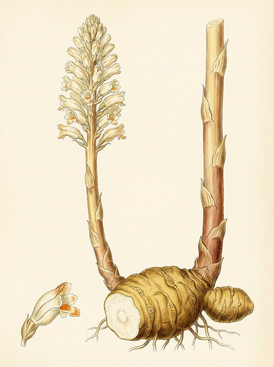 Gastrodia elata ist eine außergewöhnliche Orchidee — sie besitzt weder Blätter noch Chlorophyll und lebt vollständig parasitär auf dem Pilz Armillaria mellea (Hallimasch). Die Pflanze wird bis zu einem Meter hoch, trägt aber nur einen blattlosen Blütenstand mit kleinen, gelblich–braunen Blüten. Die medizinisch genutzte Knolle (Rhizom) wächst unterirdisch und kann bis zu 15 cm lang werden. Sie wird im Winter oder Frühjahr geerntet, gedämpft und getrocknet. Vorkommen: Südwest–China (Yunnan, Sichuan, Guizhou), Bergwäldern in 1200–3000 m Höhe. Heute überwiegend kultiviert (Anbau seit den 1970ern).