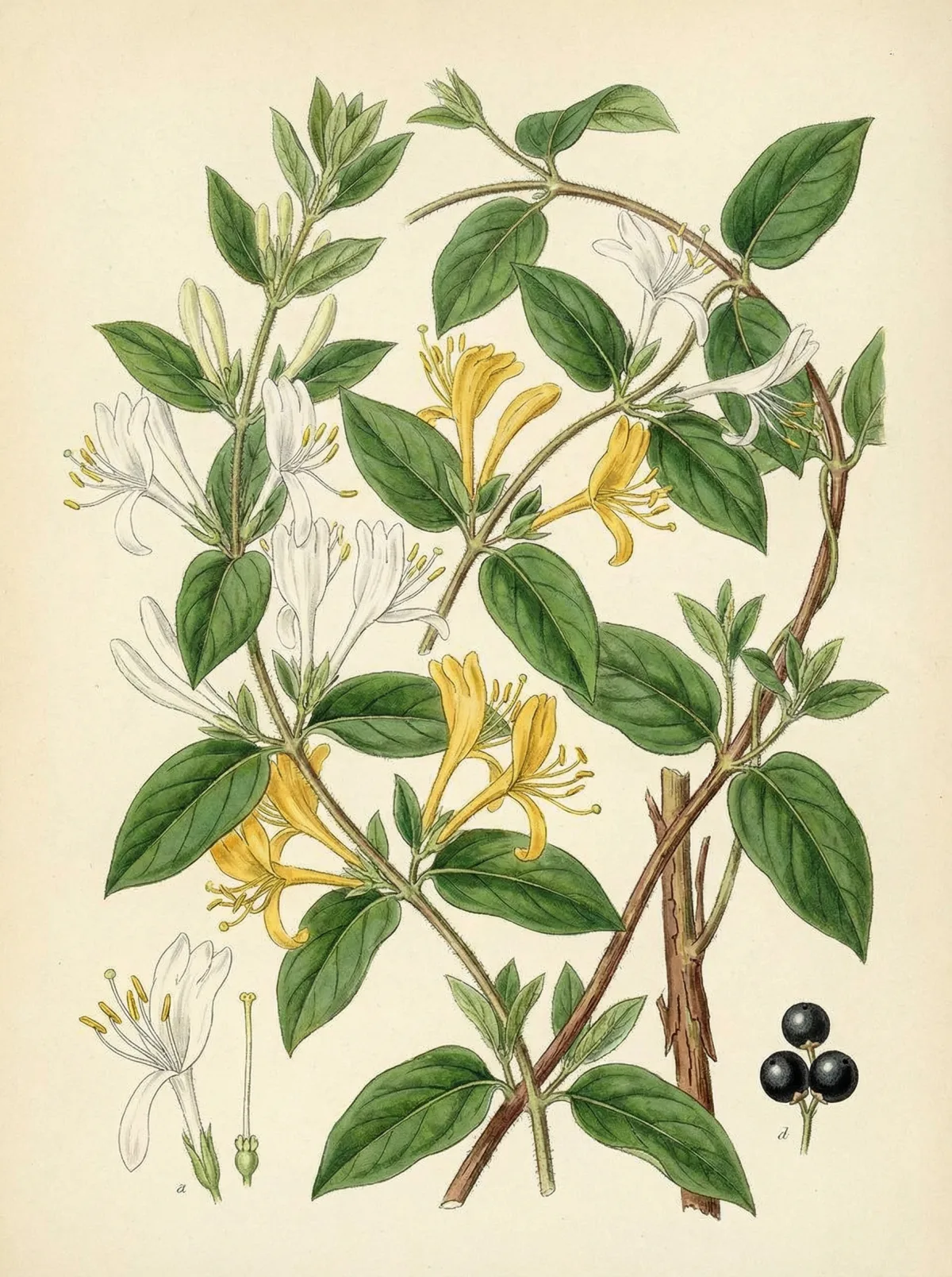 Lonicera japonica ist eine kletternde, halbimmergrüne Pflanze aus der Familie der Geißblattgewächse (Caprifoliaceae). Sie wird bis zu 10 m lang und trägt paarweise stehende, röhrenförmige Blüten mit intensivem süßem Duft — ein Erkennungsmerkmal, das die Pflanze auch im westlichen Garten beliebt macht.
