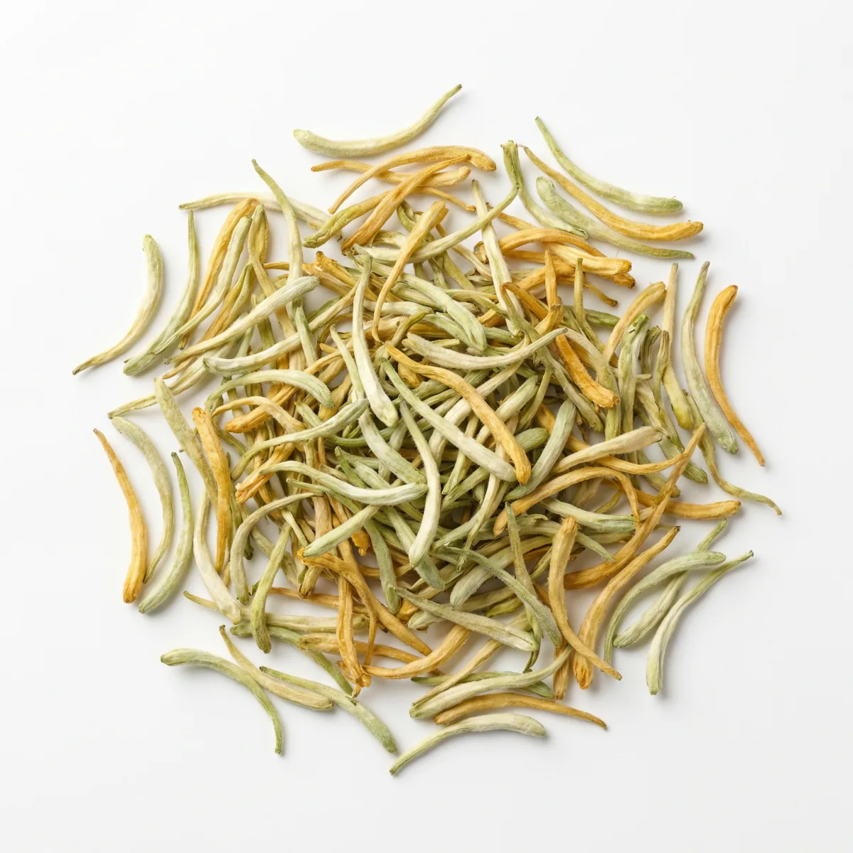 Jin Yin Hua — die Gold–Silber–Blüte — hat ihren Namen von einem faszinierenden Naturphänomen: Die Blüten öffnen sich zunächst reinweiß wie Silber und wandeln sich im Laufe des Tages zu sattem Gelb wie Gold. An einer einzigen Pflanze leuchten beide Farben gleichzeitig — ein Bild, das chinesische Dichter und Ärzte seit Jahrhunderten begeistert.