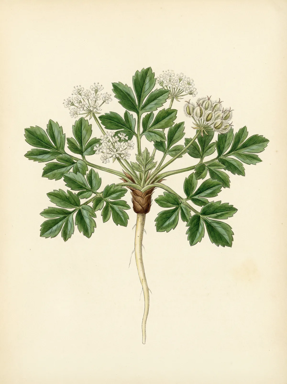 Die weißen Doldenblüten erscheinen im Sommer und tragen kleine, gerippte Früchte. Die medizinisch verwendete Wurzel ist zylindrisch, 15–30 cm lang, gelblich–weiß und stärkereich. Sie hat einen süßen, leicht aromatischen Geschmack.