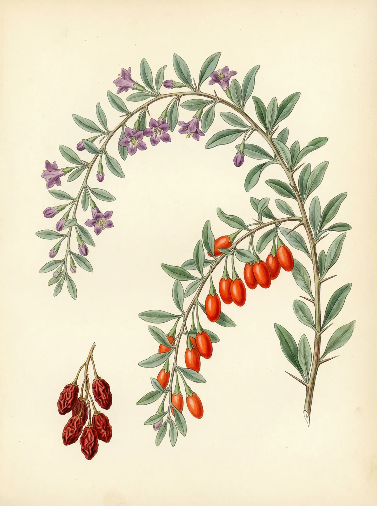 Lycium barbarum L. ist ein laubabwerfender Strauch aus der Familie der Nachtschattengewächse (Solanaceae), der 1–3 m Wuchshöhe erreicht. Die überhängenden, dornigen Zweige tragen kleine, länglich–lanzettliche Blätter und zartviolette Trichterblüten, die von Insekten bestäubt werden.