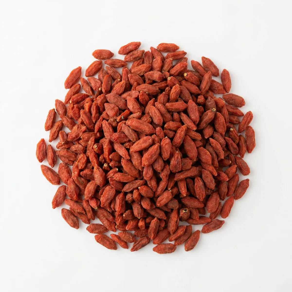 Die Früchte — leuchtend rote, längliche Beeren von 1–2 cm Länge — werden bei Vollreife geerntet und schonend getrocknet. Hochwertige Ware hat eine intensive rote Farbe, ist weich und süß im Geschmack. Übergroße, gleichmäßig geformte Beeren deuten häufig auf Schwefelung oder Düngungsmissbrauch hin.