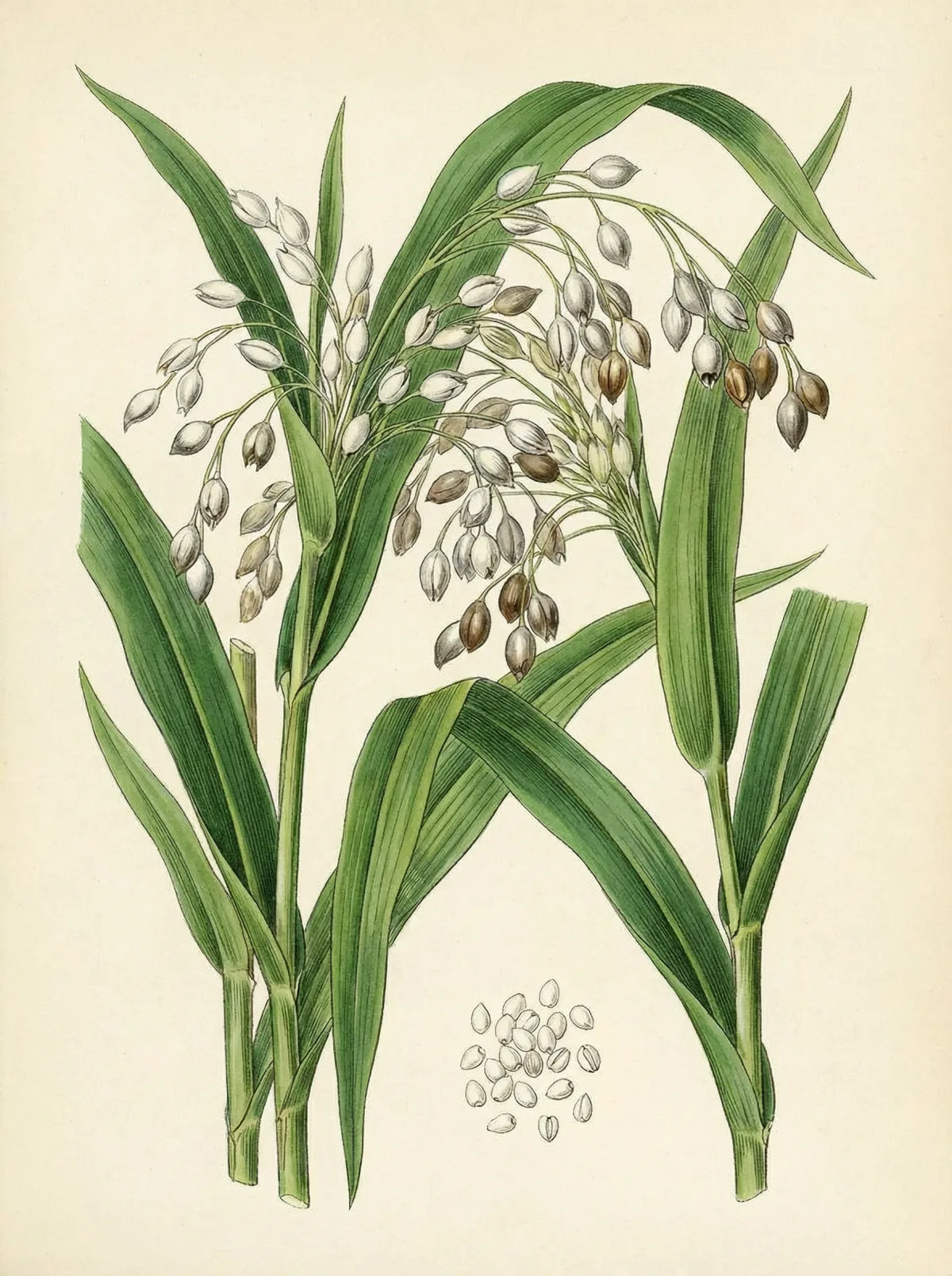 Yi Yi Ren gehört zu den ältesten Nahrungsmittel–Arzneien Chinas. Im Shén Nóng Běn Cǎo Jīng wird es als Kraut der Oberen Klasse geführt — geeignet für die Langzeiteinnahme, da es mild und ohne Nebenwirkungen den Körper stärkt. Der Name Yi Yi Ren (藏苡仁) leitet sich von der Pflanze Coix lacryma–jobi ab, die im Deutschen Hiobsträne heißt — benannt nach den tränenförmigen, perlenartigen Samen. In vielen asiatischen Ländern ist Yi Yi Ren ein alltägliches Nahrungsmittel und wird in Suppen, Congee und Desserts verwendet. Eine berühmte Geschichte erzählt vom Han–Dynastie–General Ma Yuan, der im 1. Jahrhundert n. Chr. seine Truppen während eines Feldzugs im tropisch–feuchten Süden mit Yi Yi Ren vor Feuchtigkeit–Krankheiten schützte. Als er einen Wagen voll der Samen mit nach Hause brachte, wurde er fälschlich beschuldigt, Perlen geschmuggelt zu haben.