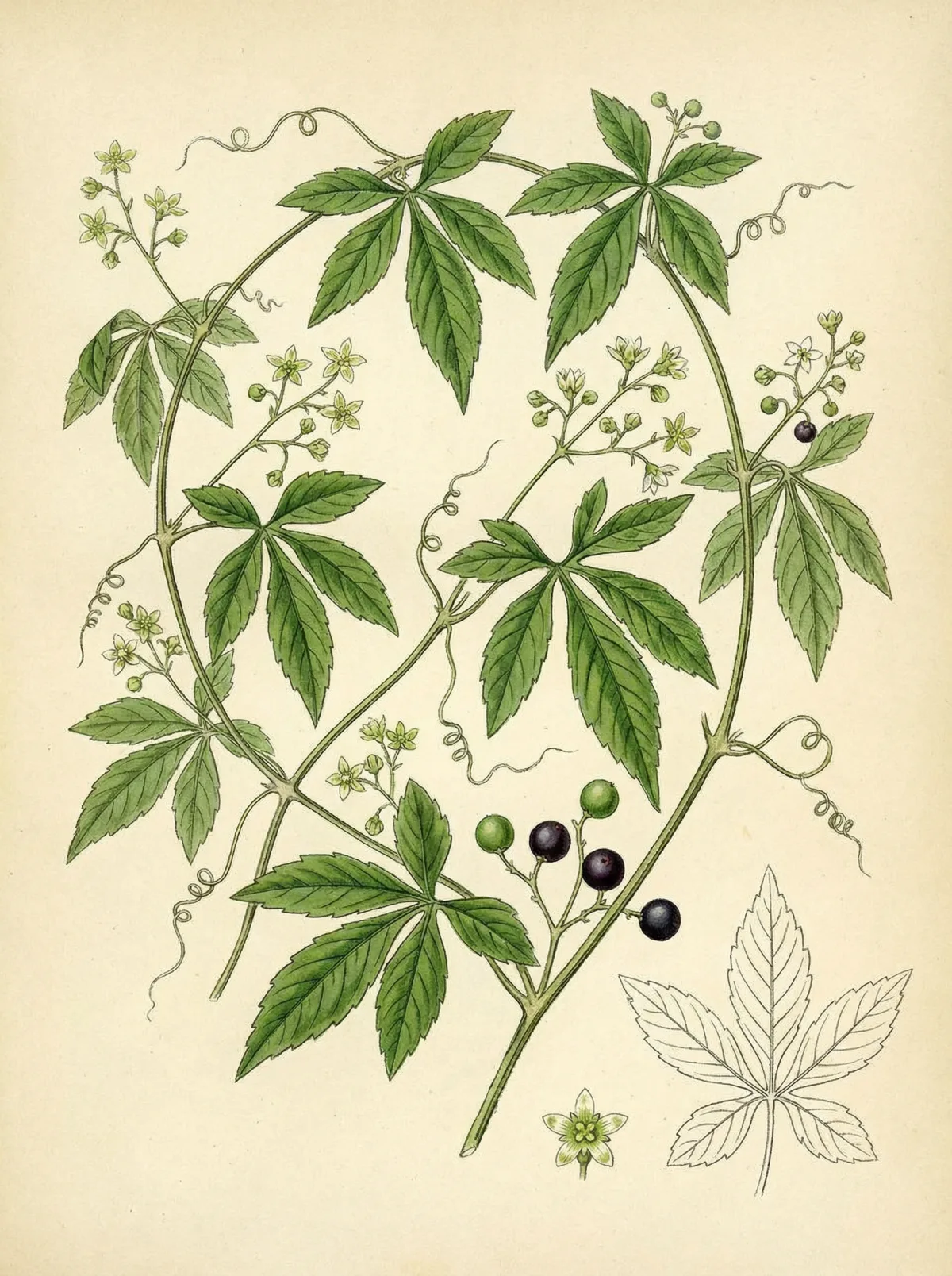 Gynostemma pentaphyllum ist eine kletternde, mehrjährige Staude aus der Familie der Kürbisgewächse (Cucurbitaceae). Die Pflanze wird mehrere Meter lang und bildet zarte Ranken, mit denen sie an Bäumen und Sträuchern emporklettert. Die Blätter sind charakteristisch fünfteilig gefiedert — daher der Artname „pentaphyllum" — und haben einen leicht bittersüßen Geschmack.