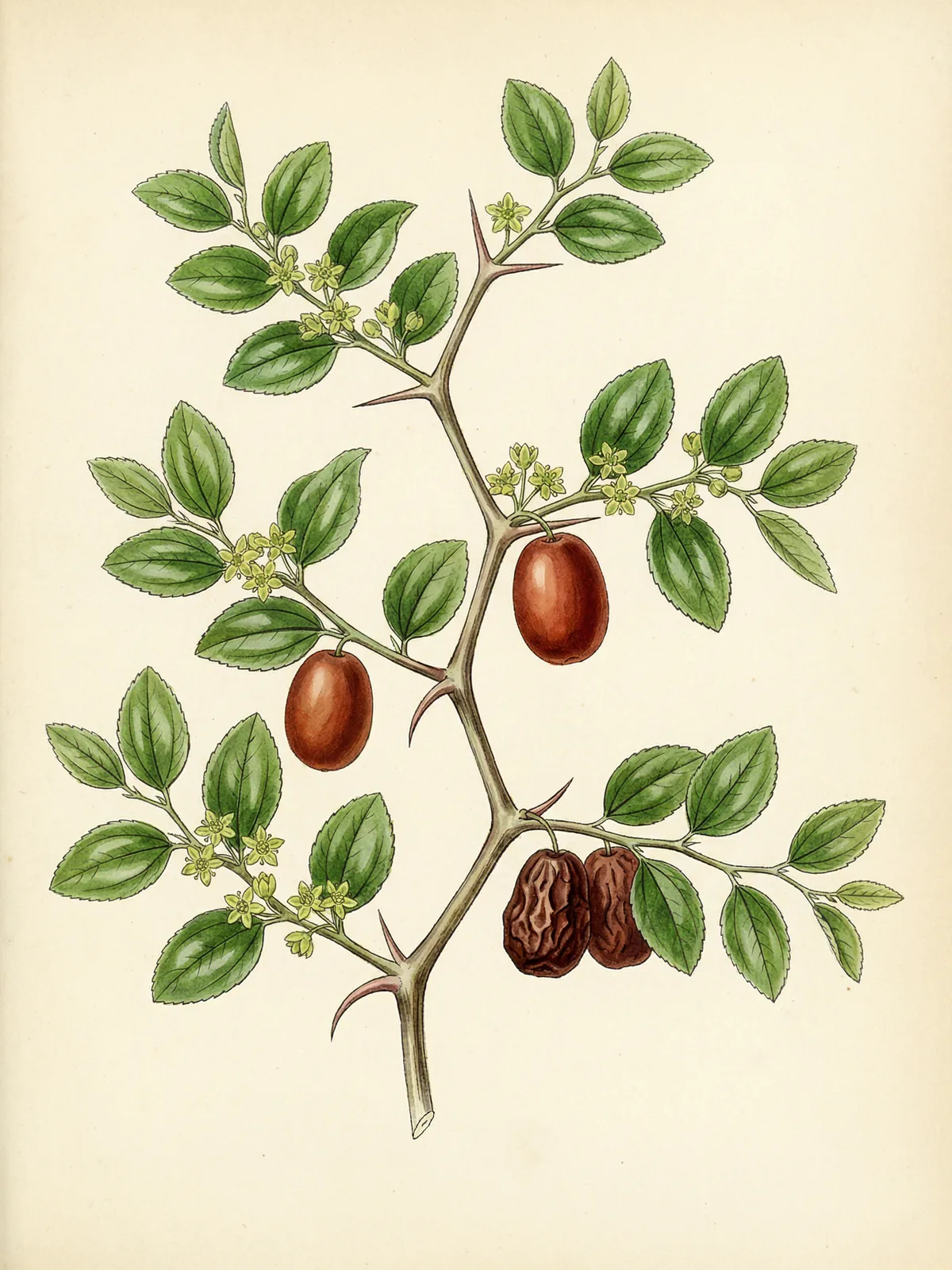 Die Jujube gehört zu den ältesten Kulturpflanzen Chinas — archäologische Funde belegen ihren Anbau seit mindestens 8.000 Jahren. Im Shén Nóng Běn Cǎo Jīng wird sie als Arznei der oberen Klasse geführt, die „das Qi der Mitte stärkt und den Geist beruhigt". Schon damals galt sie als Nahrungsmittel und Medizin zugleich — eine Doppelrolle, die sie bis heute beibehält.