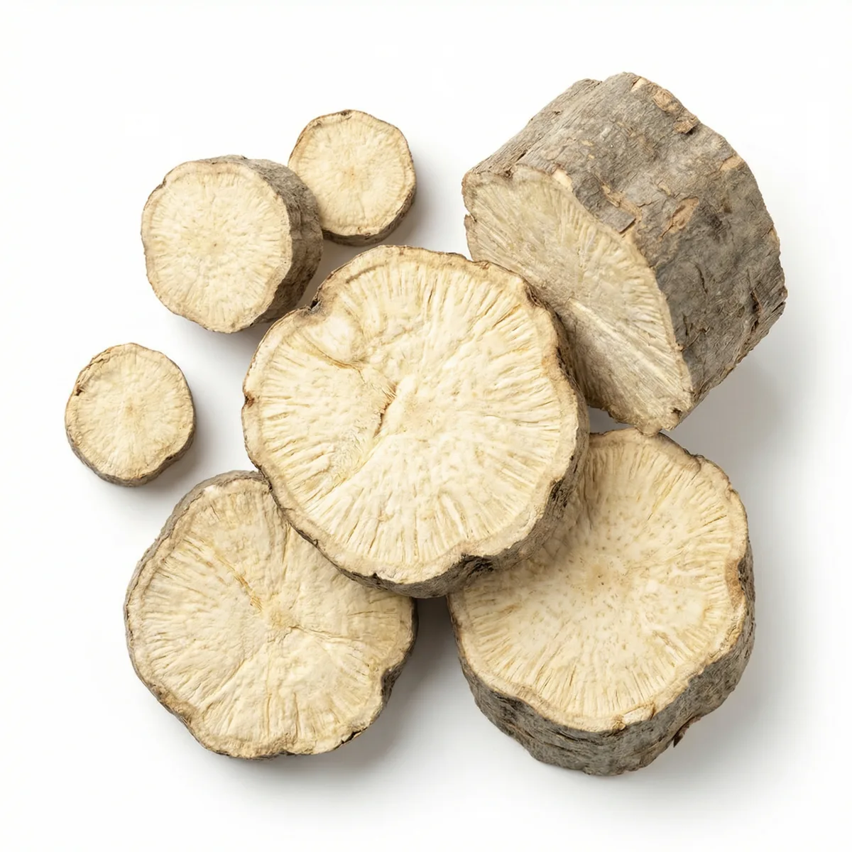 Ge Gen befreit die Oberfläche und löst die Muskeln — besonders bei Erkältung mit Nackensteifigkeit und Kopfschmerzen im Taiyang–Stadium. Es hebt das klare Yang der Milz und fördert die Bildung von Körperflüssigkeiten.