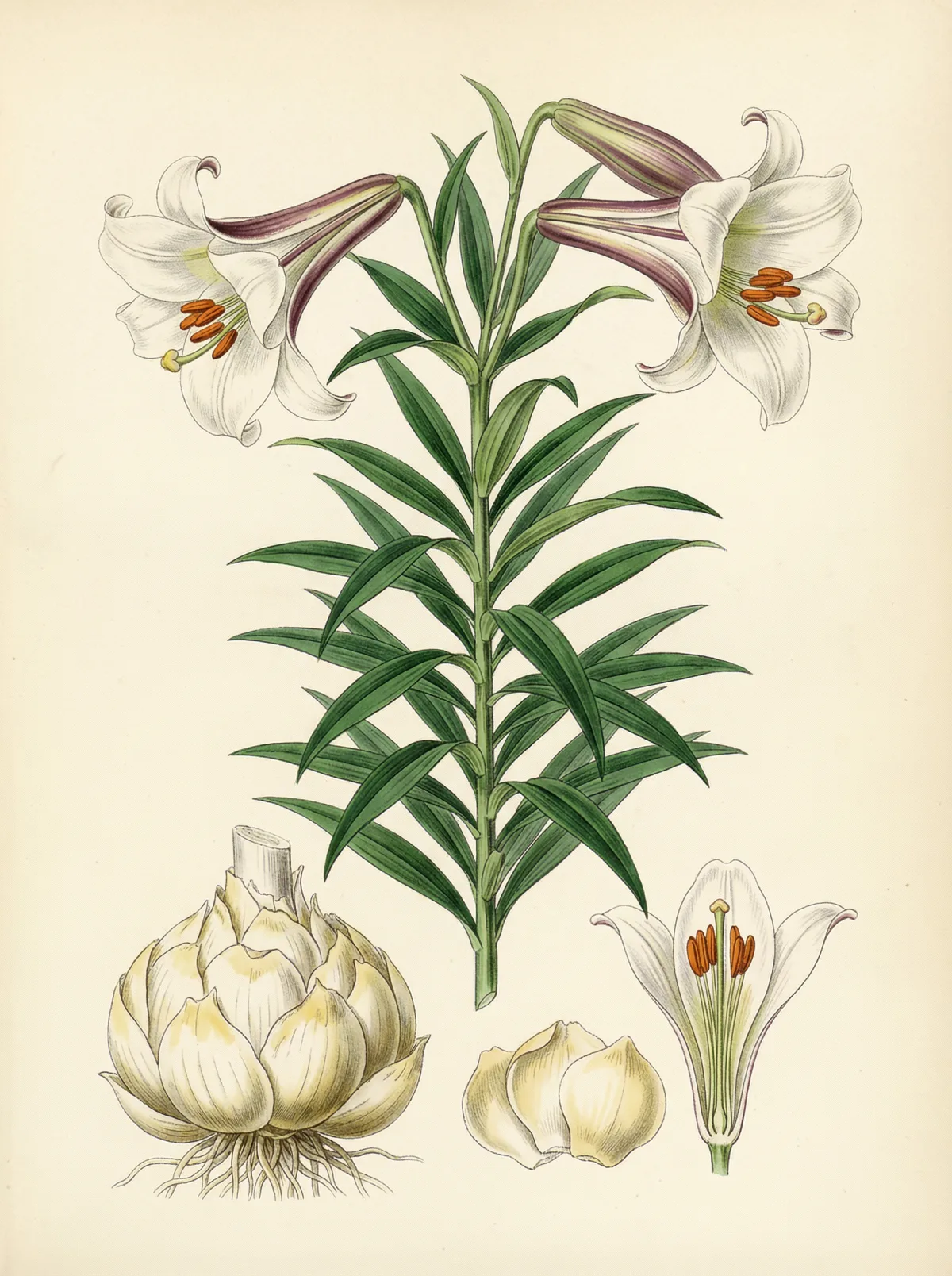 Lilium brownii und verwandte Arten (L. lancifolium, L. pumilum) gehören zur Familie der Liliengewächse (Liliaceae). Es handelt sich um ausdauernde, krautige Pflanzen mit aufrechten Stängeln, die Wuchshöhen von 50–150 cm erreichen. Die Blätter sind wechselständig, lanzettlich und dunkelgrün. Die großen, trichterförmigen Blüten sind weiß bis rosa und verströmen einen intensiven Duft.
