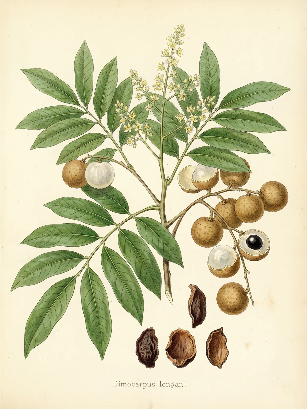 Dimocarpus longan ist ein immergrüner Baum aus der Familie der Seifenbaumgewächse (Sapindaceae), der 10–20 m hoch wird. Die kugelförmigen Früchte (2–3 cm Durchmesser) haben eine dünne, bräunliche Schale und ein transluzentes, saftiges Fruchtfleisch. Für die medizinische Verwendung wird das Fruchtfleisch getrocknet — es wird dabei dunkelbraun und schrumpelig. Vorkommen: Südostchina (Guangdong, Fujian, Guangxi), Thailand, Vietnam. Ernte im Spätsommer.