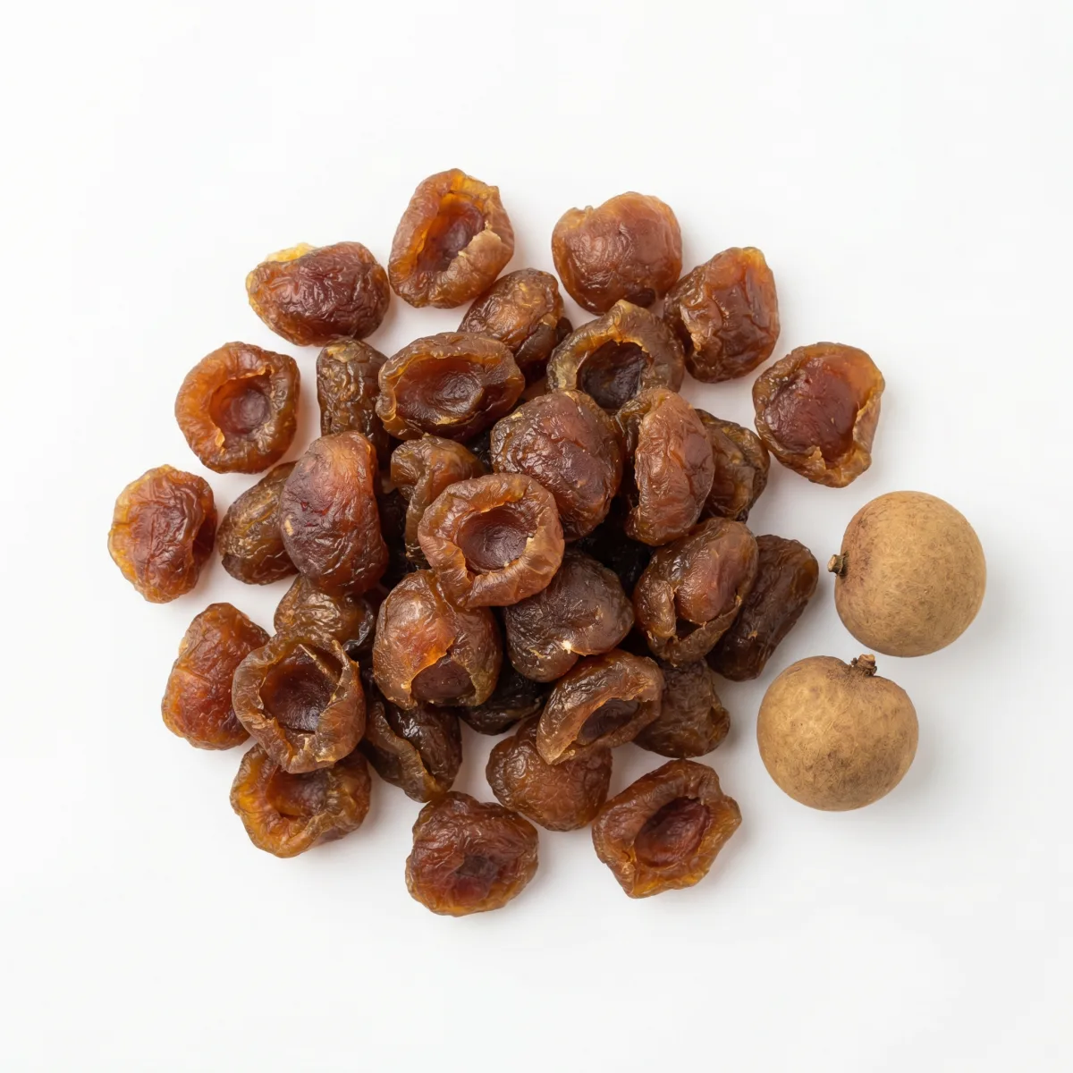 Frische Früchte werden geerntet und getrocknet — entweder an der Sonne oder mit Heißluft. Das Fruchtfleisch (Arillus) wird von Schale und Kern getrennt. Für den Einsatz als Arznei werden die getrockneten Fruchtfleischstücke verwendet — dunkelbraun, leicht klebrig und süß.