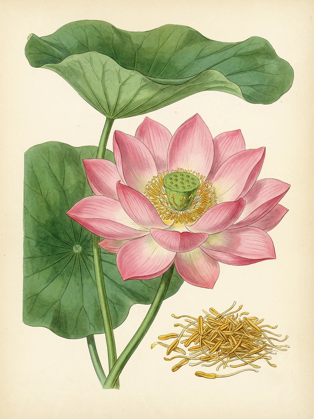 Lian Xu wird seit der Han–Dynastie (206 v. Chr.–220 n. Chr.) medizinisch genutzt und im Shén Nóng Běn Cǎo Jīng als Mittel der mittleren Klasse beschrieben. In der klassischen chinesischen Medizin galten Lotusteile als Symbol für Reinheit — die Pflanze wächst im Schlamm und bleibt dabei makellos sauber. Dieser Kontrast zwischen dem trüben Ursprung und der reinen Erscheinung machte den Lotus zum wichtigsten Reinheitssymbol des Buddhismus und Taoismus in China. Das Bào Pǔ Zǐ aus dem 4. Jahrhundert erwähnt die Staubfäden als Mittel zur Stärkung der Vitalessenz und zur Verlängerung der Lebensdauer. Li Shizhen widmete Lian Xu im Běn Cǎo Gāng Mù (1578) einen eigenen Eintrag und betonte seine Fähigkeit, das Jing zu festigen und den Geist zu stabilisieren — er empfahl es ausdrücklich bei Männern mit häufigen nächtlichen Emissionen als Zeichen von Nieren–Schwäche. Jin Suo Gu Jing Wan, die klassische Pille zur Fixierung des Goldenen Schlosses, enthält Lian Xu als Kernbestandteil und wird bis heute in der klinischen TCM–Praxis bei nächtlichen Emissionen und Spermatorrhö eingesetzt. In der taoistischen Medizin galten die goldgelben Staubfäden als konzentrierter Ausdruck der Blütenkraft des Lotus — ein Mittel, das Yang–Energie bindet, ohne sie zu erschöpfen.