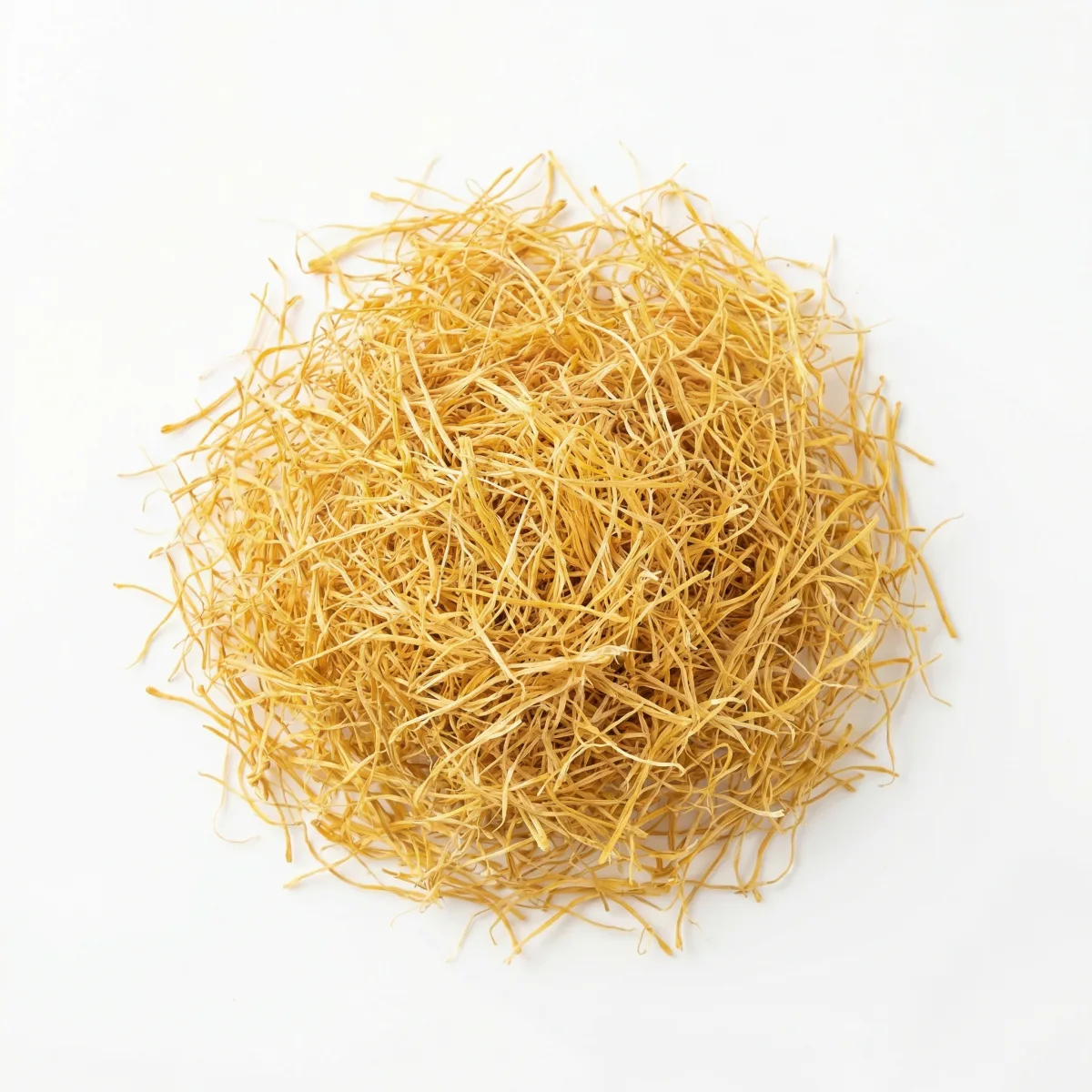 Nelumbo nucifera Gaertn. (Lotusblüte) ist eine ausdauernde Wasserpflanze aus der Familie der Nelumbonaceae. Die Pflanze wächst in seichtem Süßwasser — in Teichen, Seen und Reisfeldern — und bildet große, kreisrunde Schwimmblätter sowie aufrechte, bis zu 150 cm hohe Stängel. Die charakteristischen rosafarbenen oder weißen Blüten öffnen sich morgens und schließen sich abends; sie können einen Durchmesser von bis zu 30 cm erreichen. Lian Xu bezeichnet ausschließlich die goldgelben Staubfäden (Stamina) der Blüte — die fadenförmigen männlichen Blütenorgane, die nach dem Öffnen der Blüte geerntet werden. Die Oberfläche der Lotusteile ist durch eine Wachsschicht wasserabweisend (Lotus–Effekt), was der Pflanze ihre symbolische Reinheit verleiht. Botanisch bemerkenswert ist die Fähigkeit der Lotussamen, Jahrtausende keimfähig zu bleiben — ein Zeichen außergewöhnlicher Vitalität.