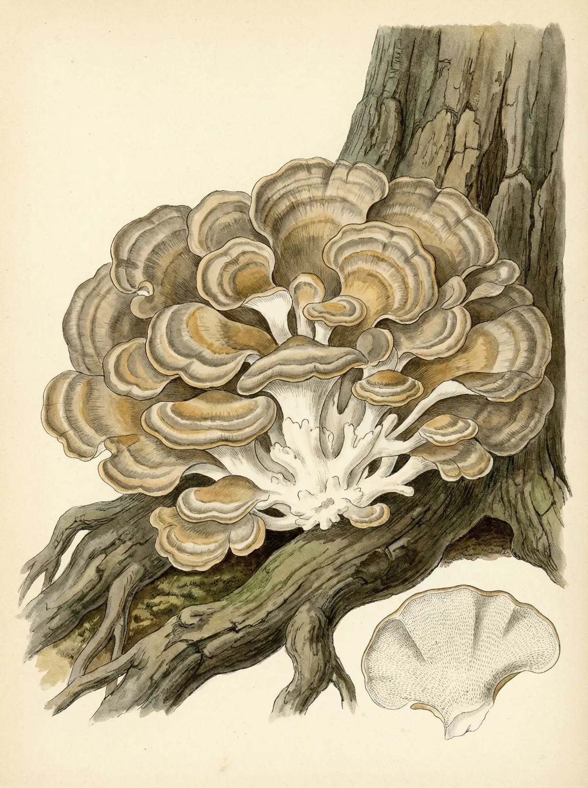 - Schmetterlingstramete (Trametes versicolor) — auch als Turkey Tail bekannt, in der westlichen Mykotherapie einer der am besten erforschten Immunpilze. PSK (Polysaccharid K) wird in Japan als zugelassenes Krebsmedikament eingesetzt.