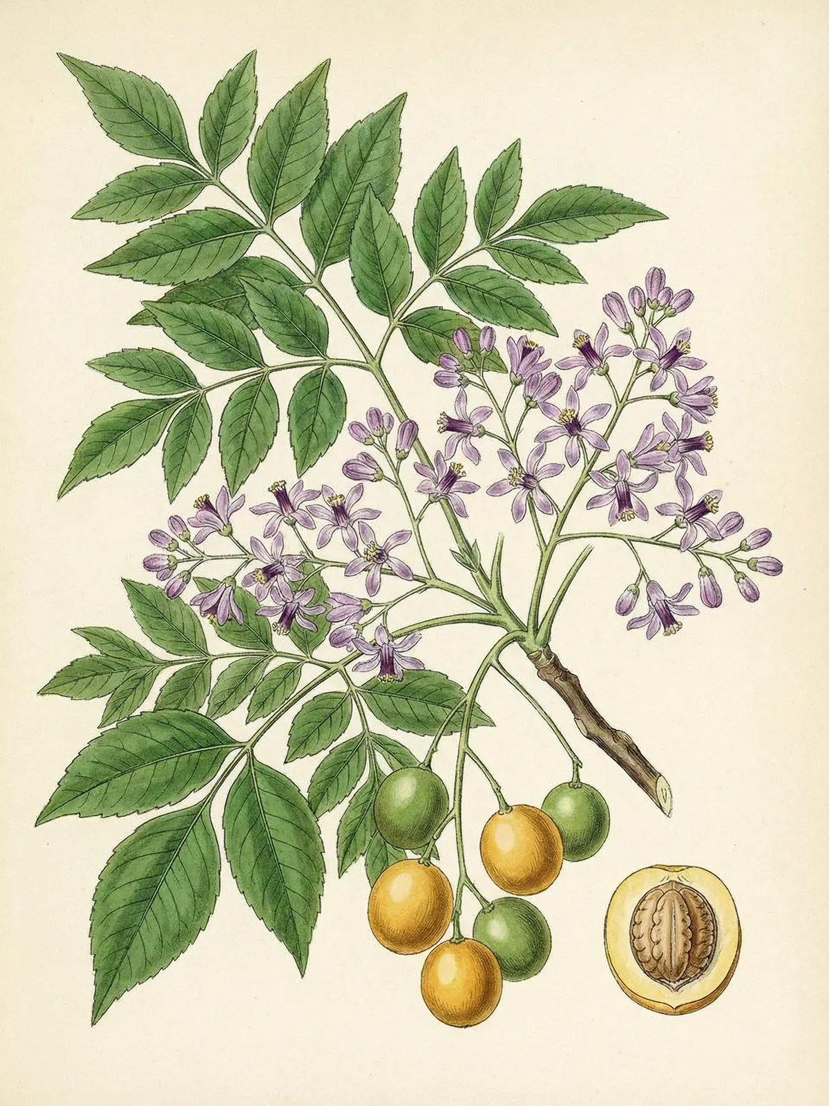 In der Volksmedizin wurden die Früchte auch äußerlich gegen Kopfläuse und Hautpilz verwendet. Die Rinde des Zedrach–Baumes (Ku Lian Pi) wird separat als Wurmmittel eingesetzt — eine interessante Parallele zur antiparasitären Wirkung der Frucht, die zeigt, wie verschiedene Pflanzenteile desselben Baumes unterschiedliche therapeutische Rollen übernehmen.