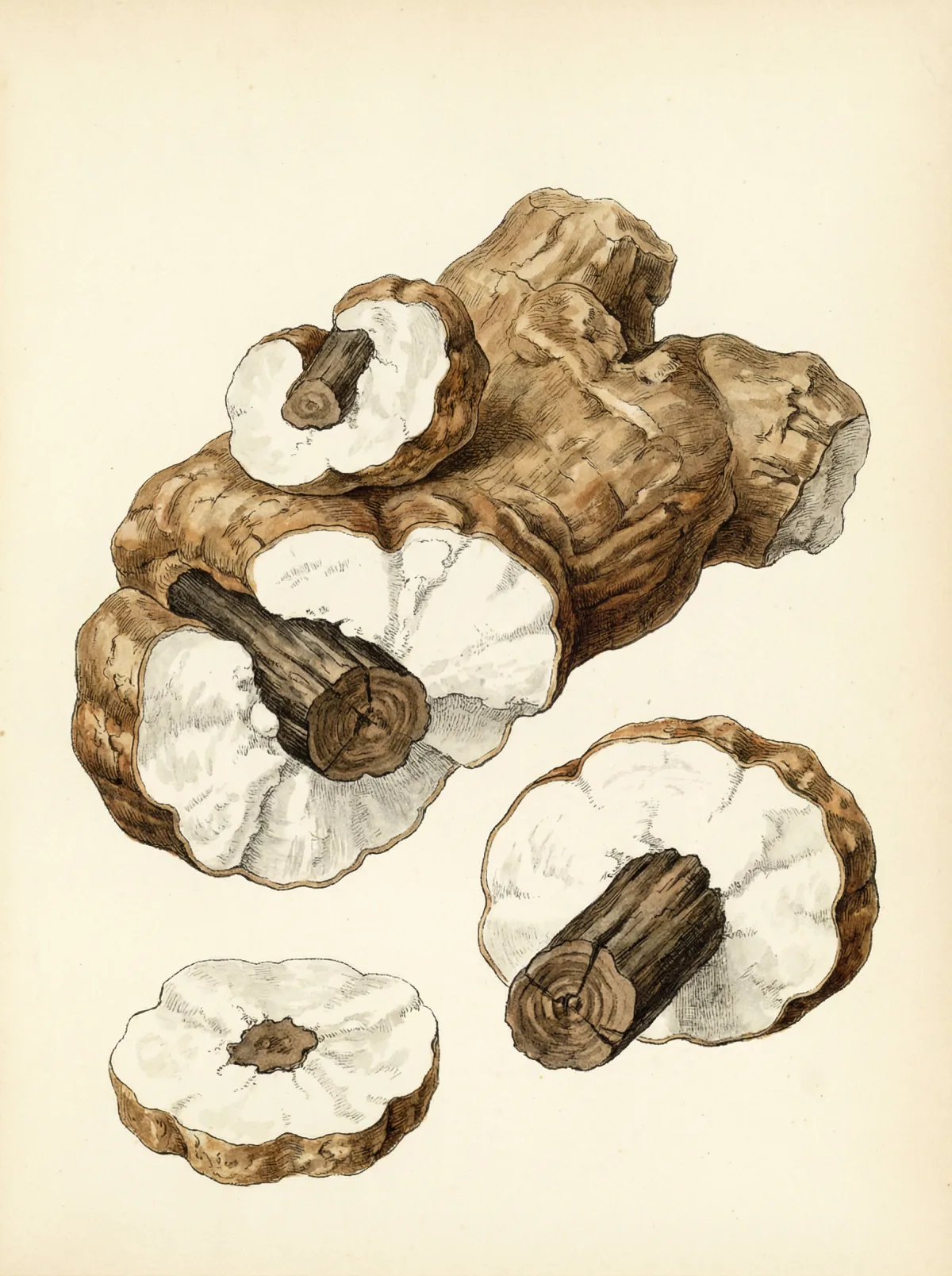 Fu Shen wird seit der Han–Dynastie (ca. 200 n. Chr.) in der chinesischen Medizin verwendet. Im Shén Nóng Běn Cǎo Jīng wird es als Variante von Fu Ling beschrieben, die besonders den Geist beruhigt und das Herz stärkt — eine Unterscheidung, die auf der feinen Beobachtung verschiedener Wirkprofile innerhalb desselben Organismus beruht.