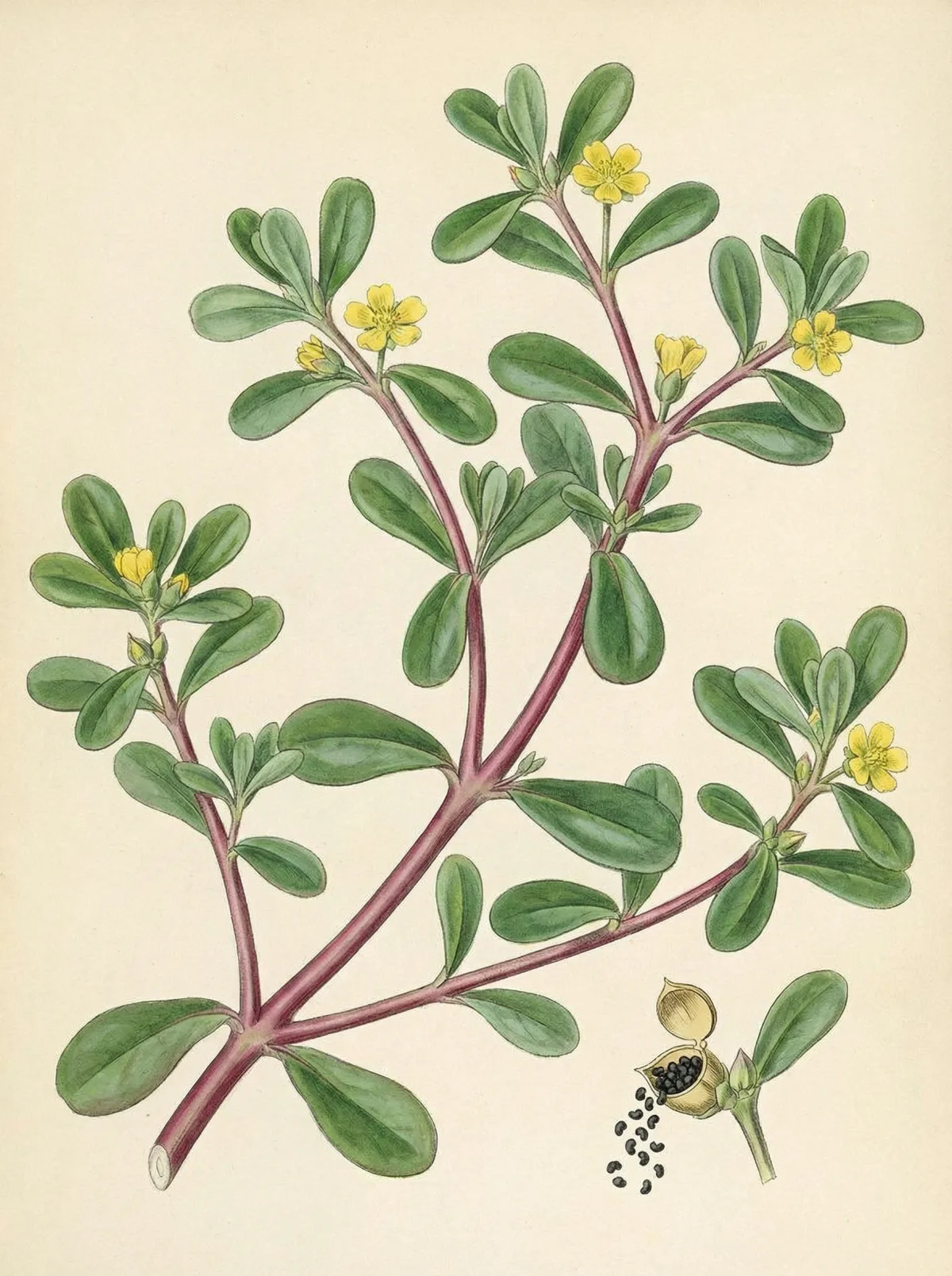 Portulaca oleracea ist eine einjährige, sukkulente Pflanze aus der Familie der Portulakgewächse (Portulacaceae). Sie wird 10–30 cm hoch, hat fleischige, spatelkörmige Blätter und rötliche Stengel. Kleine gelbe Blüten erscheinen im Sommer. Vorkommen: Weltweit verbreitet als kosmopolitisches Unkraut. In China wild und kultiviert. Bevorzugt warme, sonnige Standorte mit feuchtem Boden. Ernte im Sommer bei voller Vegetationsperiode.