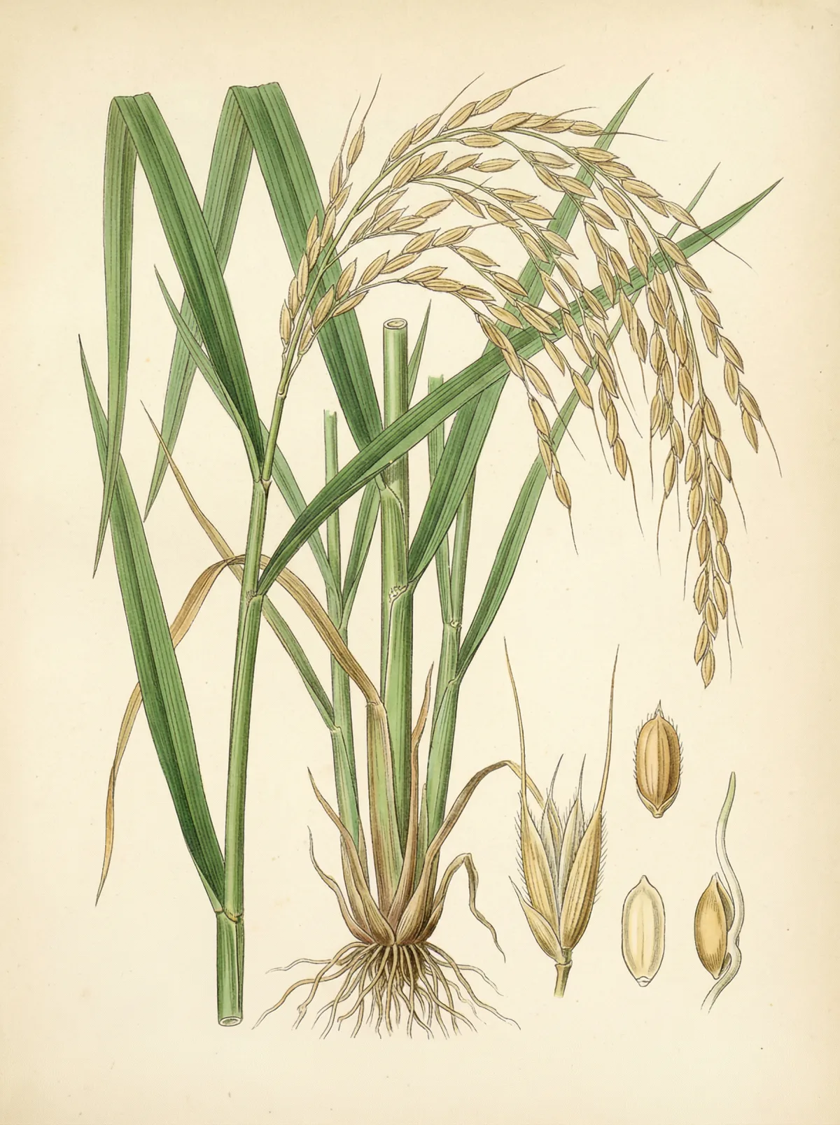 Oryza sativa L. (Reis) ist eine einjährige Graspflanze aus der Familie der Süßgräser (Poaceae), die 50–130 cm Höhe erreicht. Die Pflanze bildet aufrechte Halme mit langen, schmalen Blättern und endständige Rispen. Die Körner — umhüllt von Spelzen — sind der weltweit wichtigste Nahrungsmittelrohstoff nach Weizen.