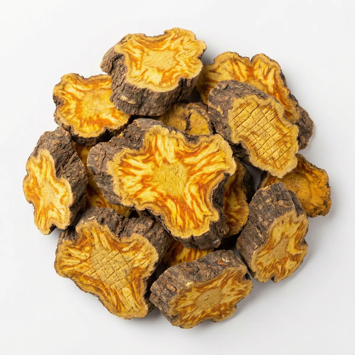 Die Arzneidroge besteht aus dem getrockneten Rhizom und der Wurzel, die im Querschnitt ein charakteristisches marmoriertes Muster zeigt — radiale Streifen aus orangefarbenen Markstrahlen durchziehen das gelblich–braune Grundgewebe. Dieser „Sternschnittmuster" genannte Querschnitt ist ein wichtiges Qualitätsmerkmal. Die Oberfläche ist dunkelbraun und längsrunzelig.