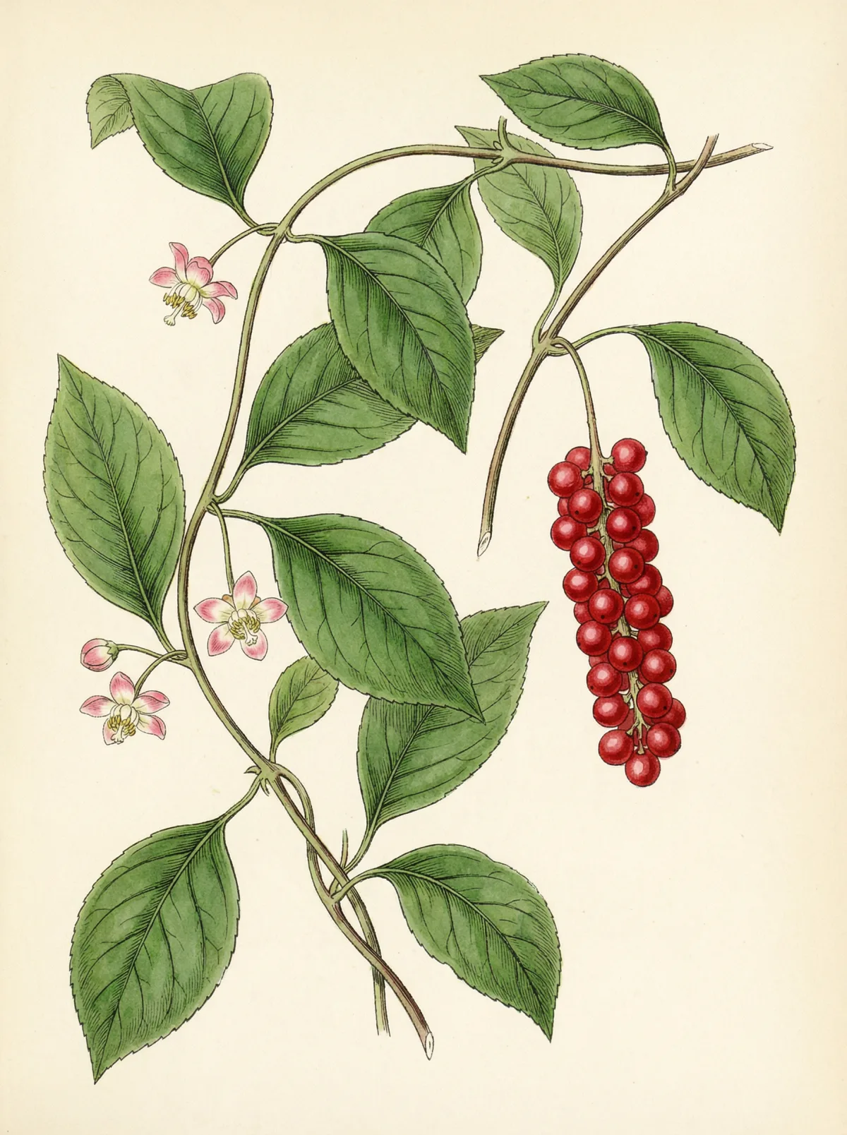 Schisandra chinensis ist eine sommergrüne, verholzende Kletterpflanze aus der Familie der Sternanisgewächse (Schisandraceae). Sie erreicht Wuchslängen von 5–10 m und bildet wechselständige, elliptische Blätter mit feinem Zahnrand. Die kleinen, cremefarbenen bis rosafarbenen Blüten erscheinen im Frühsommer. Die therapeutisch genutzten Früchte reifen im Spätsommer zu leuchtend roten, traubenförmig angeordneten Beeren heran. Jede Beere enthält einen nierenförmigen Samen. Die Schale schmeckt süß und sauer, das Fruchtfleisch salzig und scharf, der Samen bitter — daher der Name Fünf–Geschmäcker–Frucht. Vorkommen: