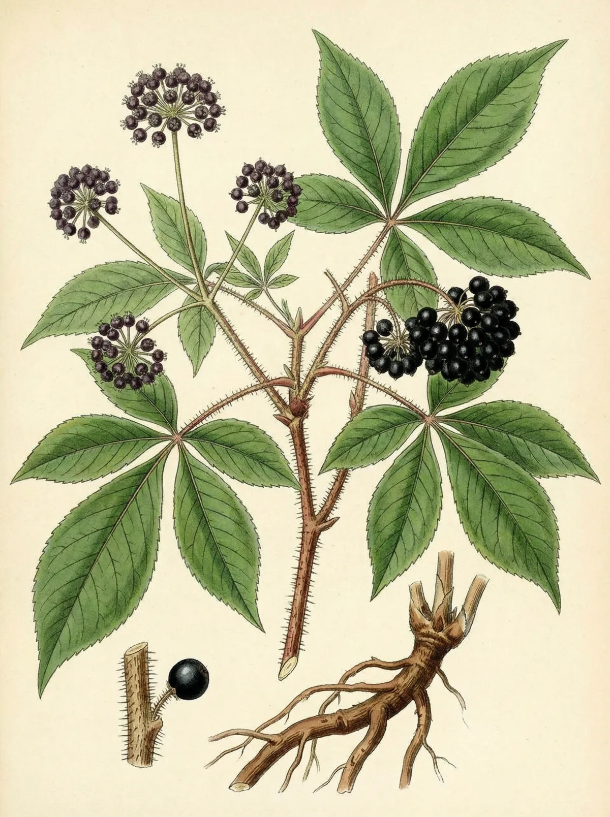 Eleutherococcus senticosus (Rupr. & Maxim.) Maxim. ist ein dorniger Strauch aus der Familie der Araliengewächse (Araliaceae) — derselben Familie wie der echte Ginseng (Panax ginseng). Er wird 2–3 m hoch und trägt handförmig gefiederte Blätter mit fünf Fiederblättchen. Die unscheinbaren Blüten sind gelblich–grün bis violett und stehen in kugeligen Dolden.