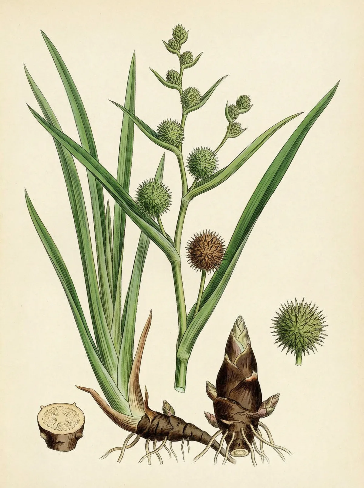 San Leng (Sparganium stoloniferum) ist ein Sumpfgewächs, dessen kantiges, dreieckiges Rhizom — daher der Name Dreikant — in der TCM als kraftvolles Mittel gegen Blut–Stase eingesetzt wird. Es gehört zur unteren Klasse: starke Wirkung, nur kurzfristig und unter fachkundiger Anleitung. San Leng bricht verhärtete Massen auf und löst fixierte Blut–Stagnation im unteren Erwärmer.