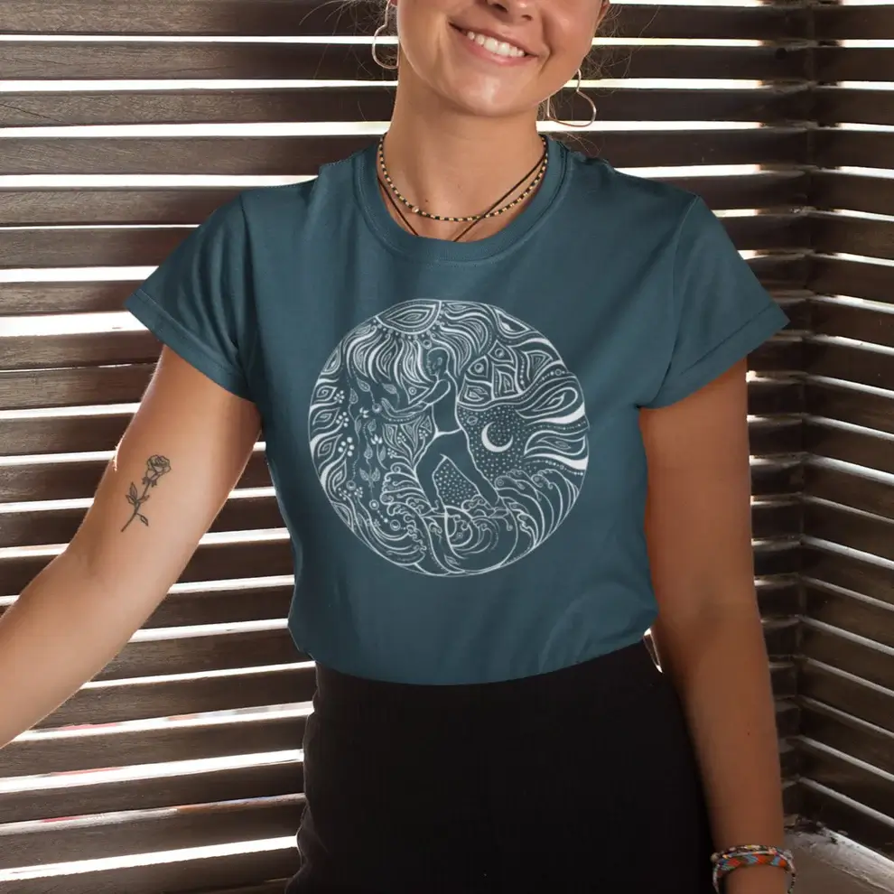Indossate questa elegante camicia da donna per testimoniare il vostro profondo legame con il mondo della scienza. cinque elementi e sentire il Energia positiva, che vi circonda. Perfetto per le donne che cercano una moda sostenibile con un significato spirituale.